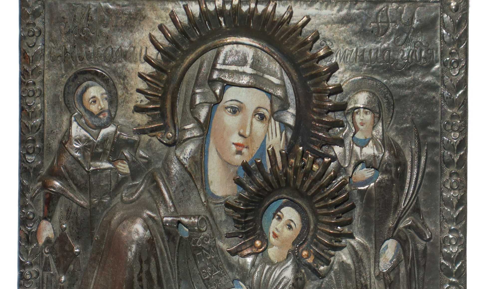 Icona russa con riza in argento 925 raffigurante Madonna con bambino e santi, 1830 h cm 15X13 Punzonata 1830 iniziali argentiere C. Sull'angolo destro stemma impresso Punzonata 1830 iniziali argentiere C. Sull'angolo destro stemma impresso