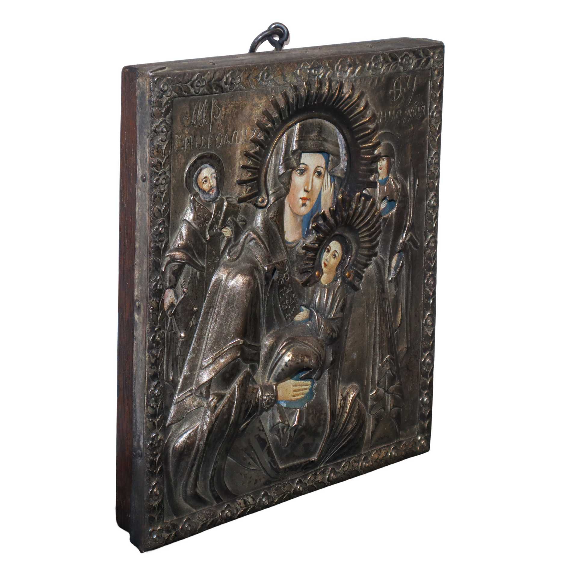 Icona russa con riza in argento 925 raffigurante Madonna con bambino e santi, 1830