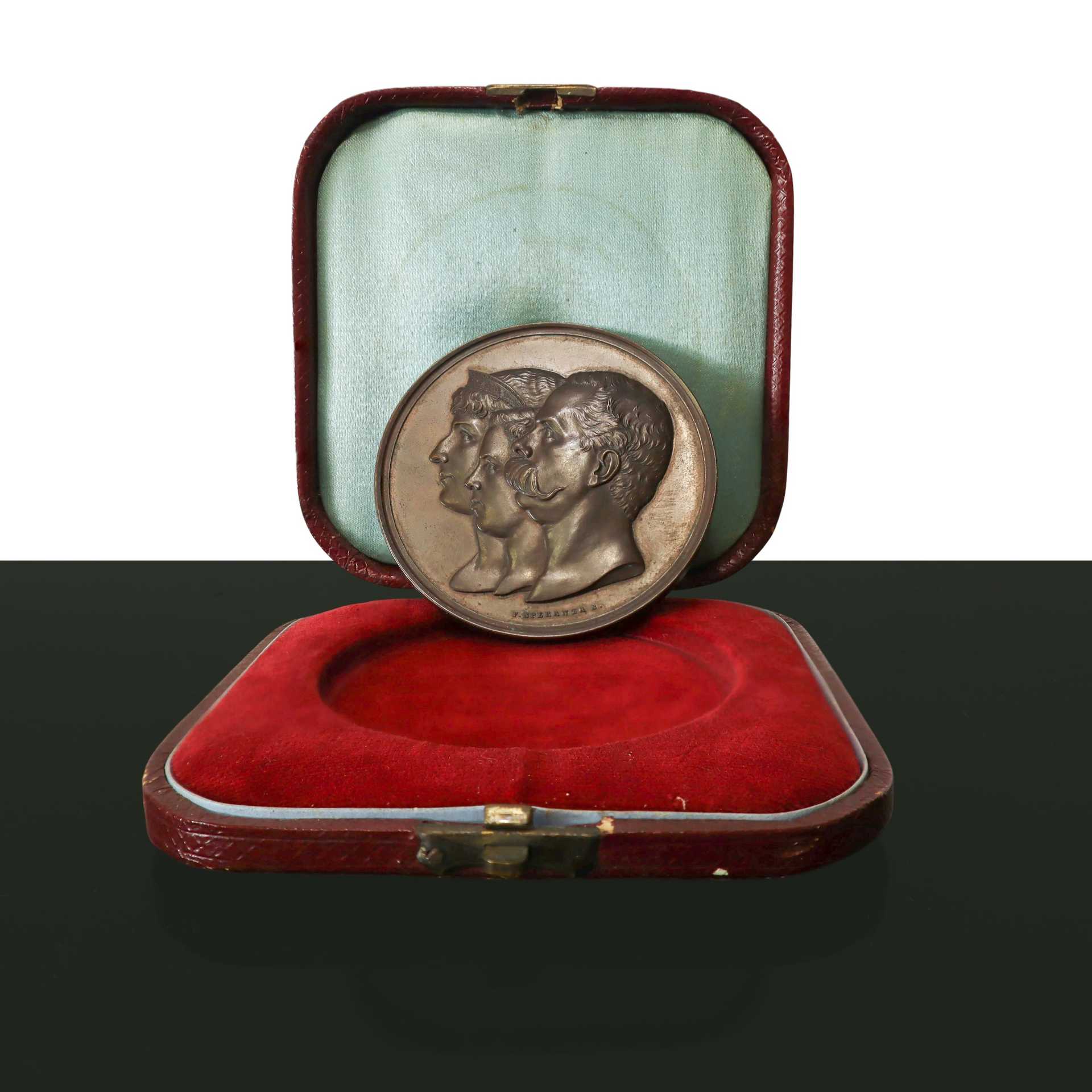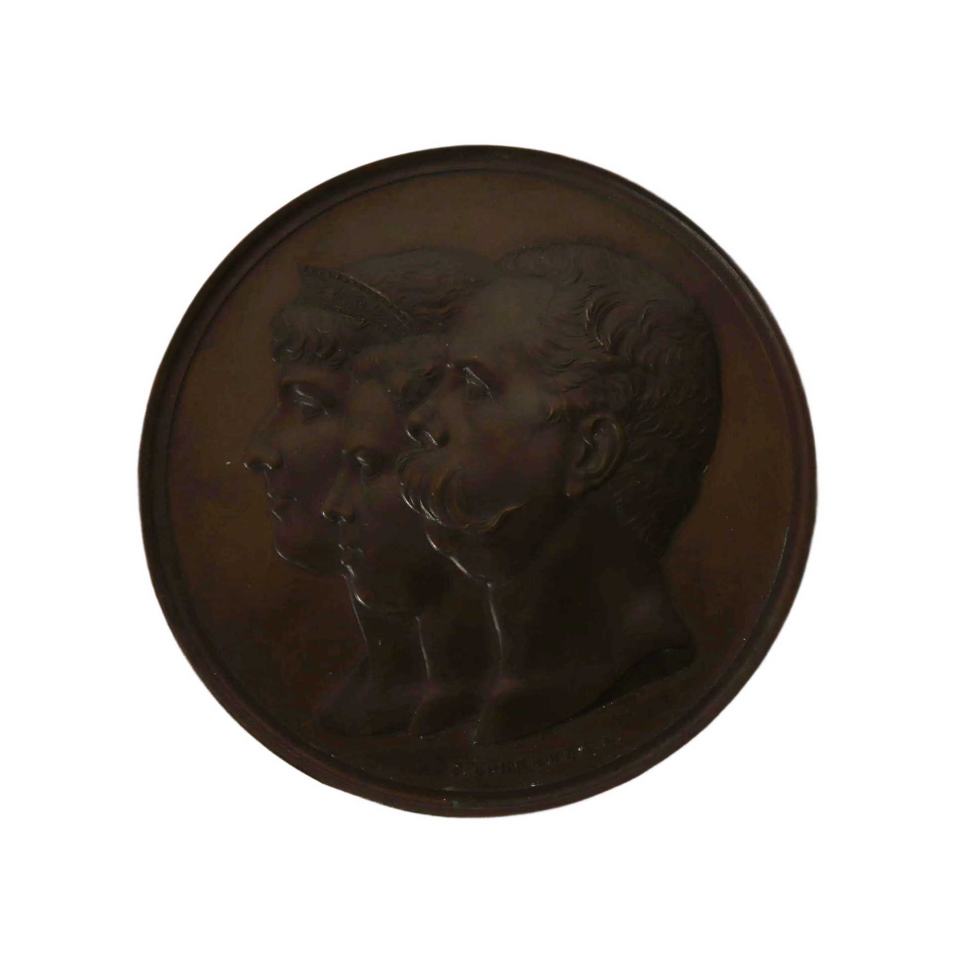Medaglia con teste accolFine della regina Margherita, principe Vittorio Emanuele e Re Umbert I sovrani D'Italia, Messina 17 January 1781