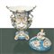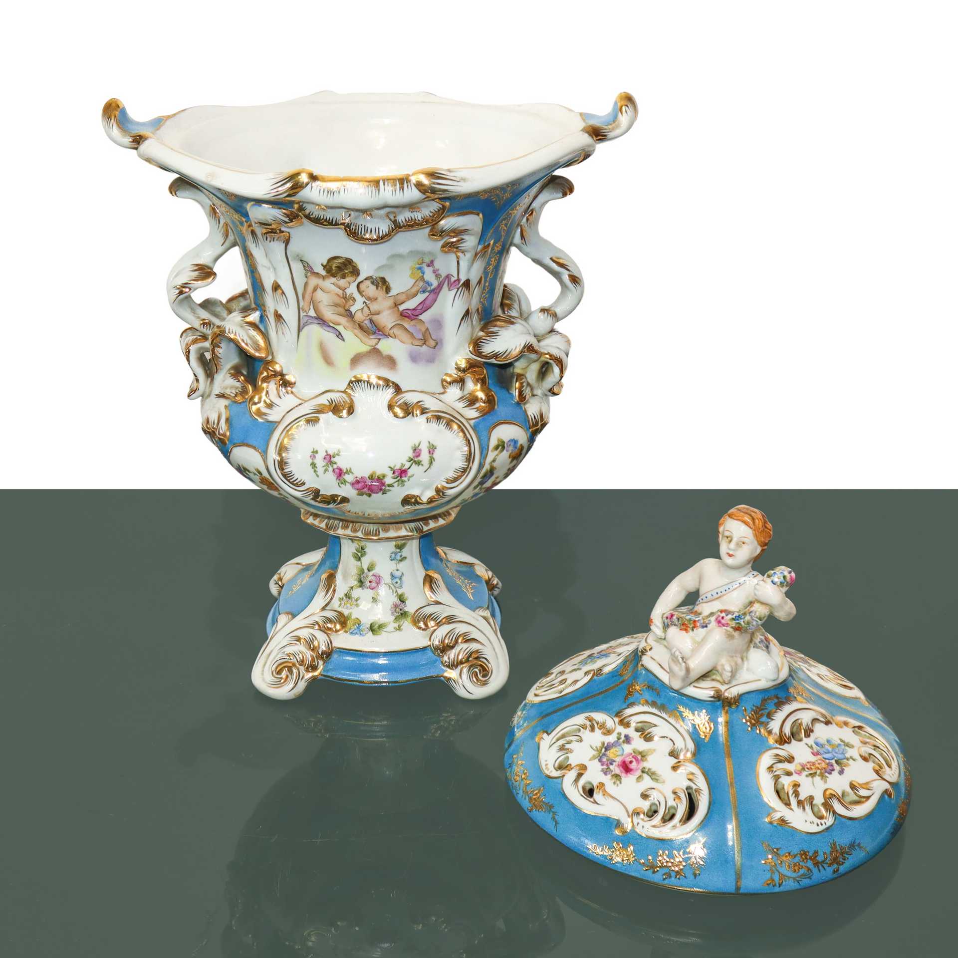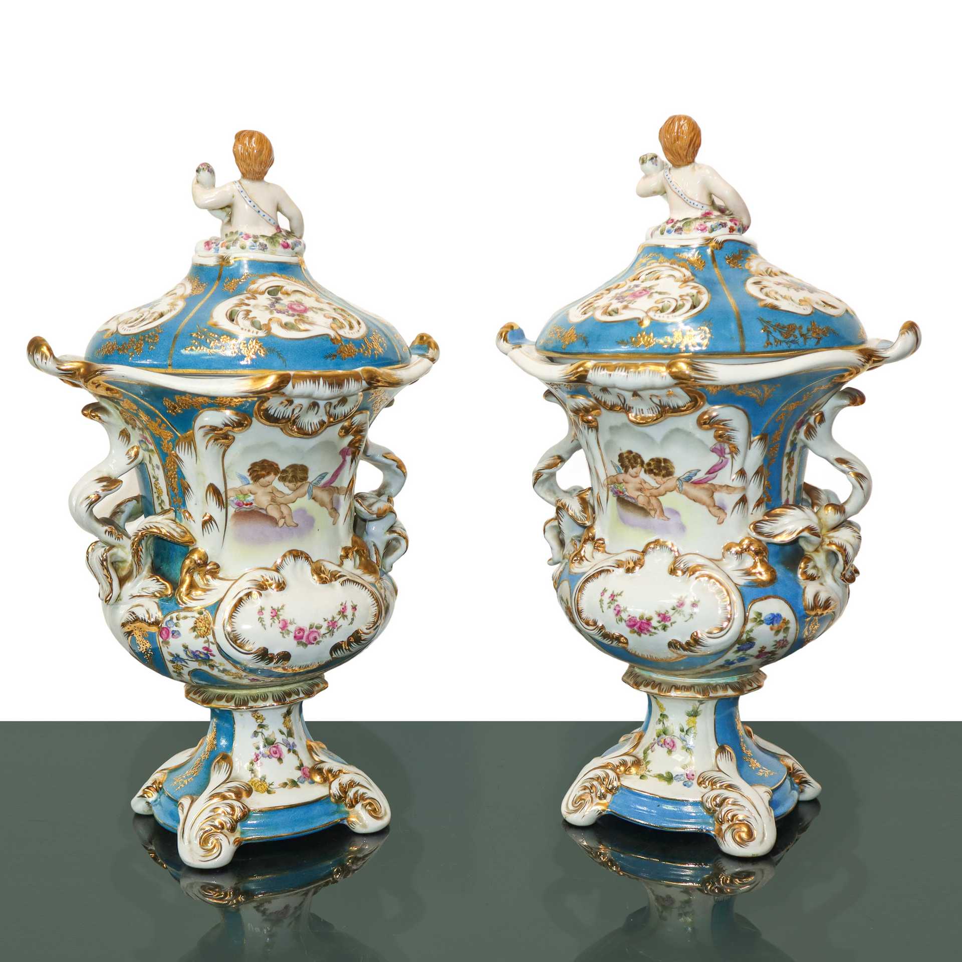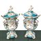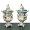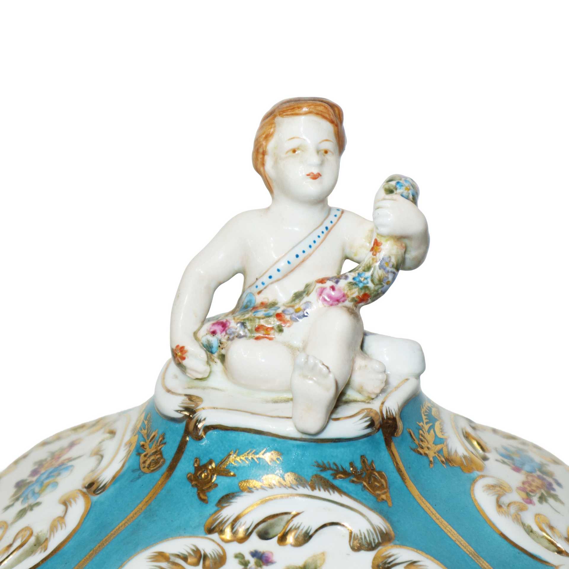 Porcelain Meissen - Coppia di poutiche in porcellana coperchio con amorino policromo su base bianca e turchese con decorazioni in oro e decori floreali con angioletti sul fronte, 20° secolo