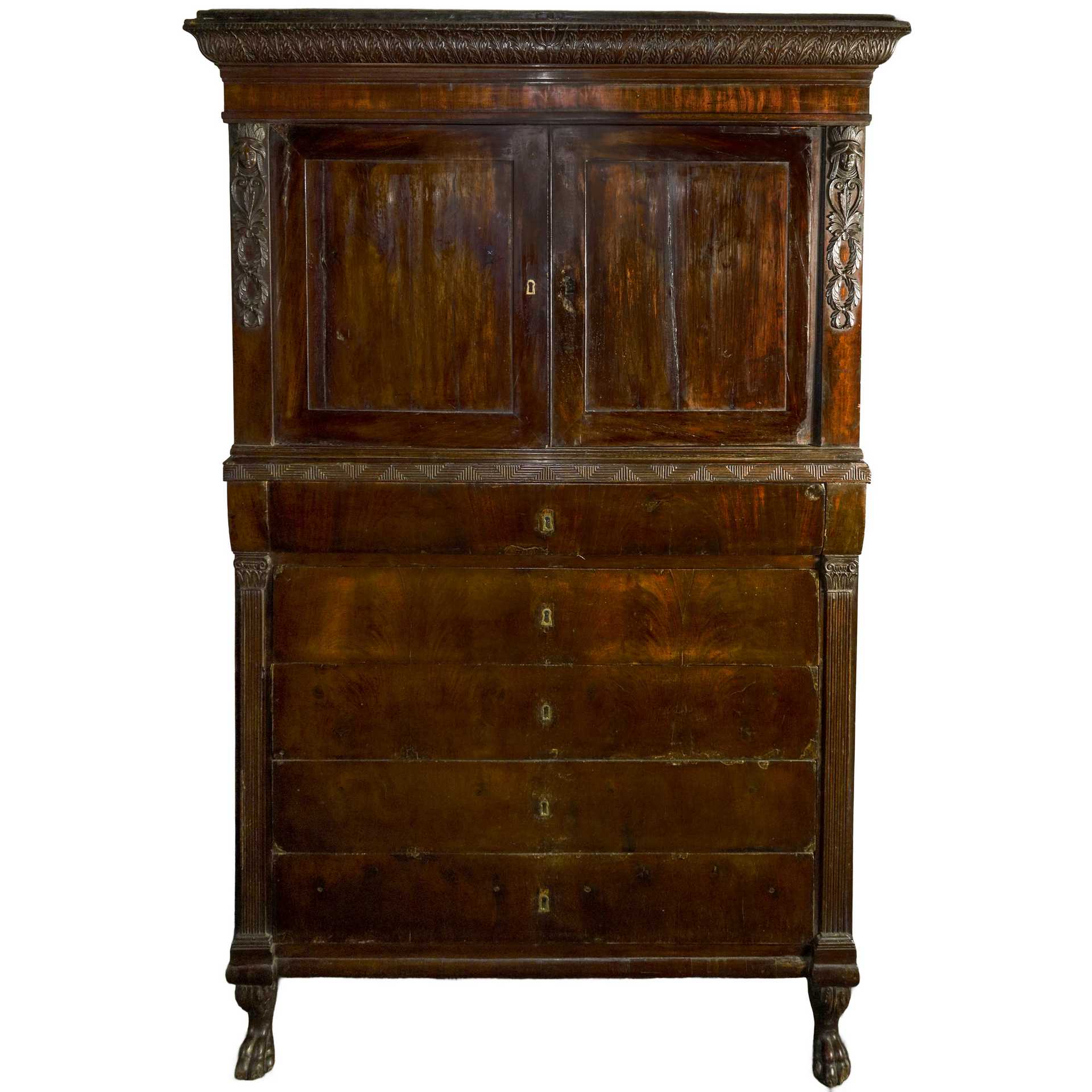 Chiffonier in piuma di mogano Impero, Sicily Primi 19° secolo Cappello intagliato e scolpito, 2 sportelli a scomparsa con all'interno 7 cassetti e specchio. Corpo basso con 5 cassetti e ai lati lesene con capitelli. Piedi felini Cappello intagliato e scolpito, 2 sportelli a scomparsa con all'interno 7 cassetti e specchio. Corpo basso con 5 cassetti e ai lati lesene con capitelli. Piedi felini
