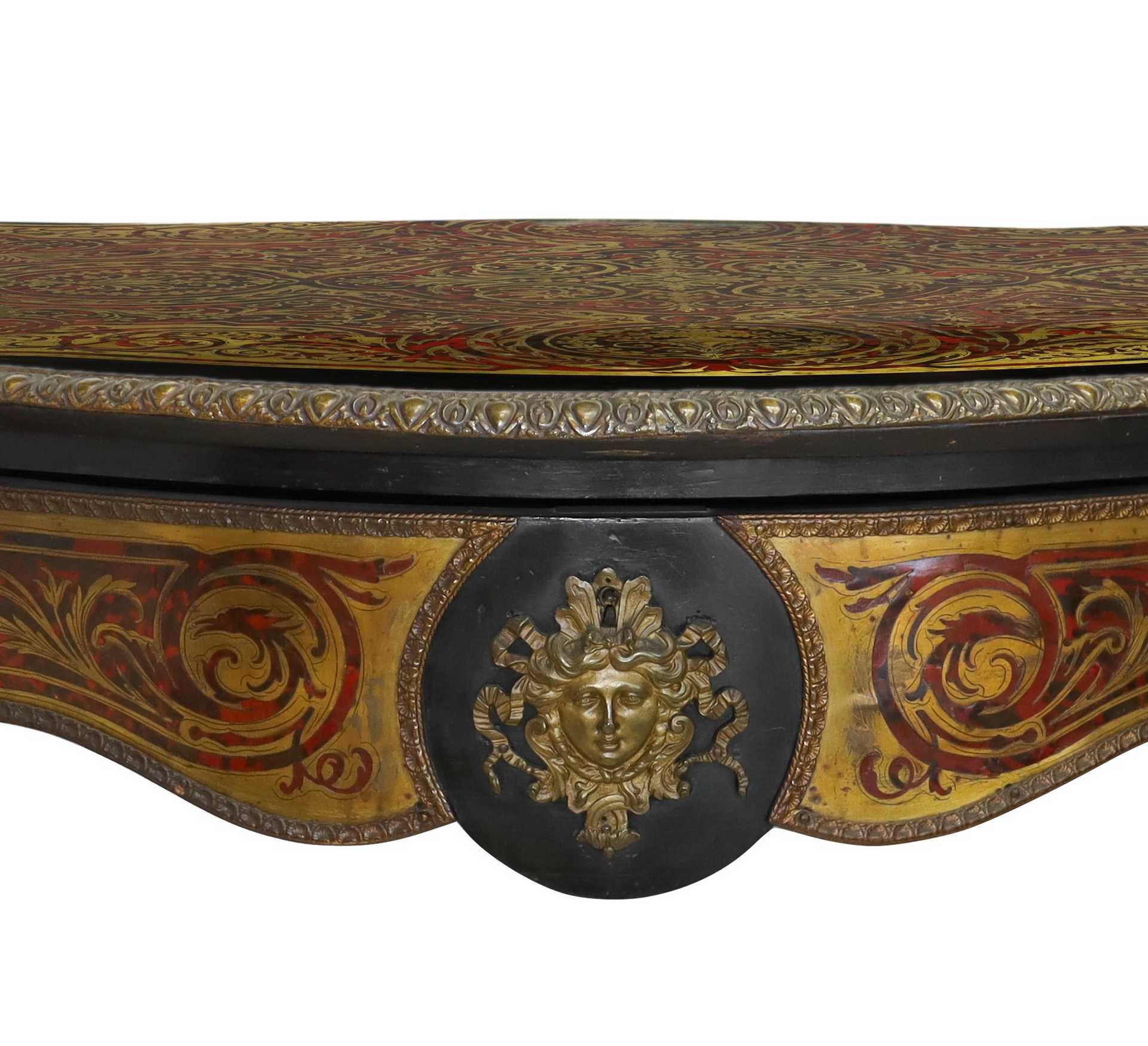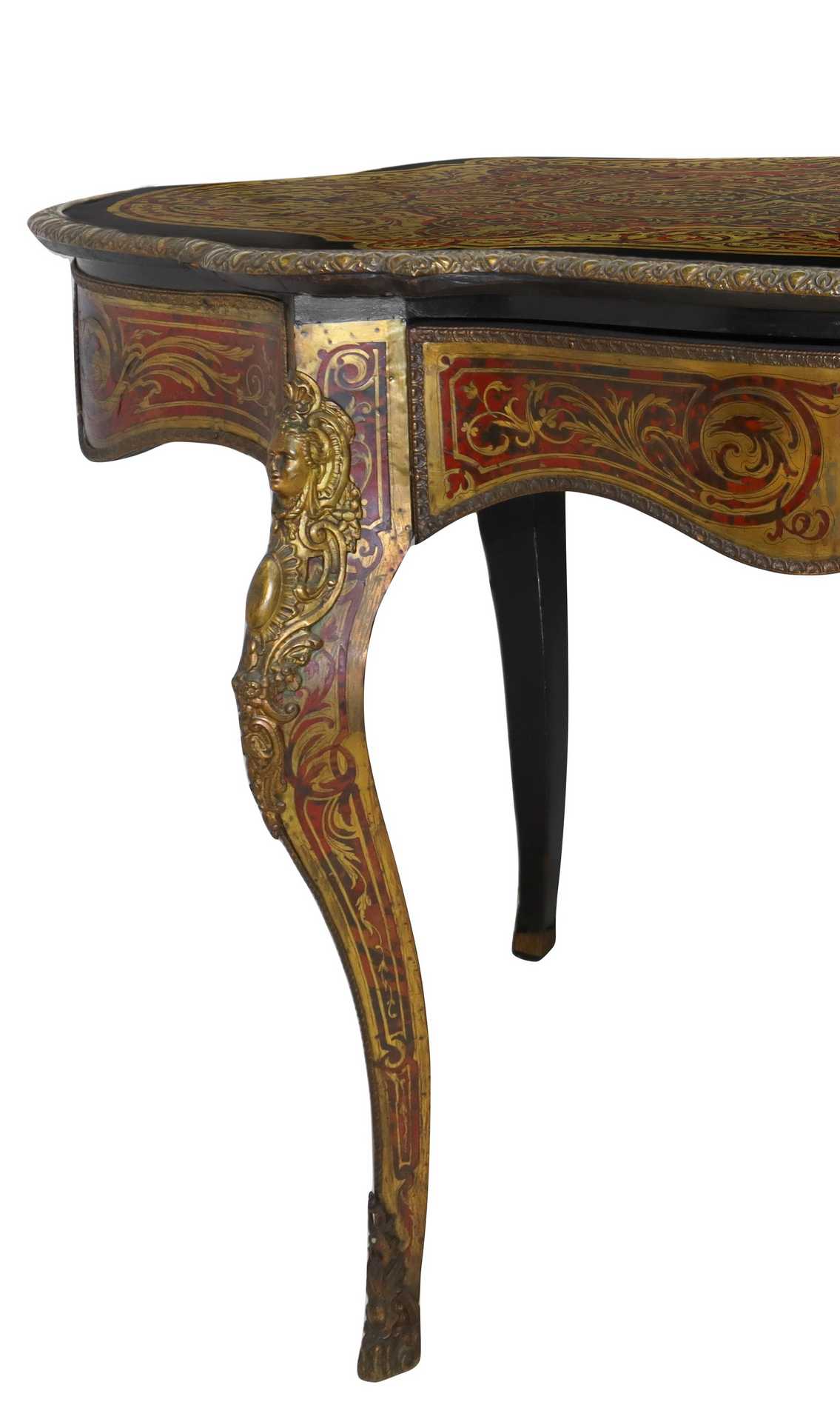 Tavolo Boulle, Fine 19° secolo H cm 79x145, larghezza 92 Con intarsi in rame, bronzi alle gambe e nel sottopiano.Con intarsi in rame, bronzi alle gambe e nel sottopiano.
