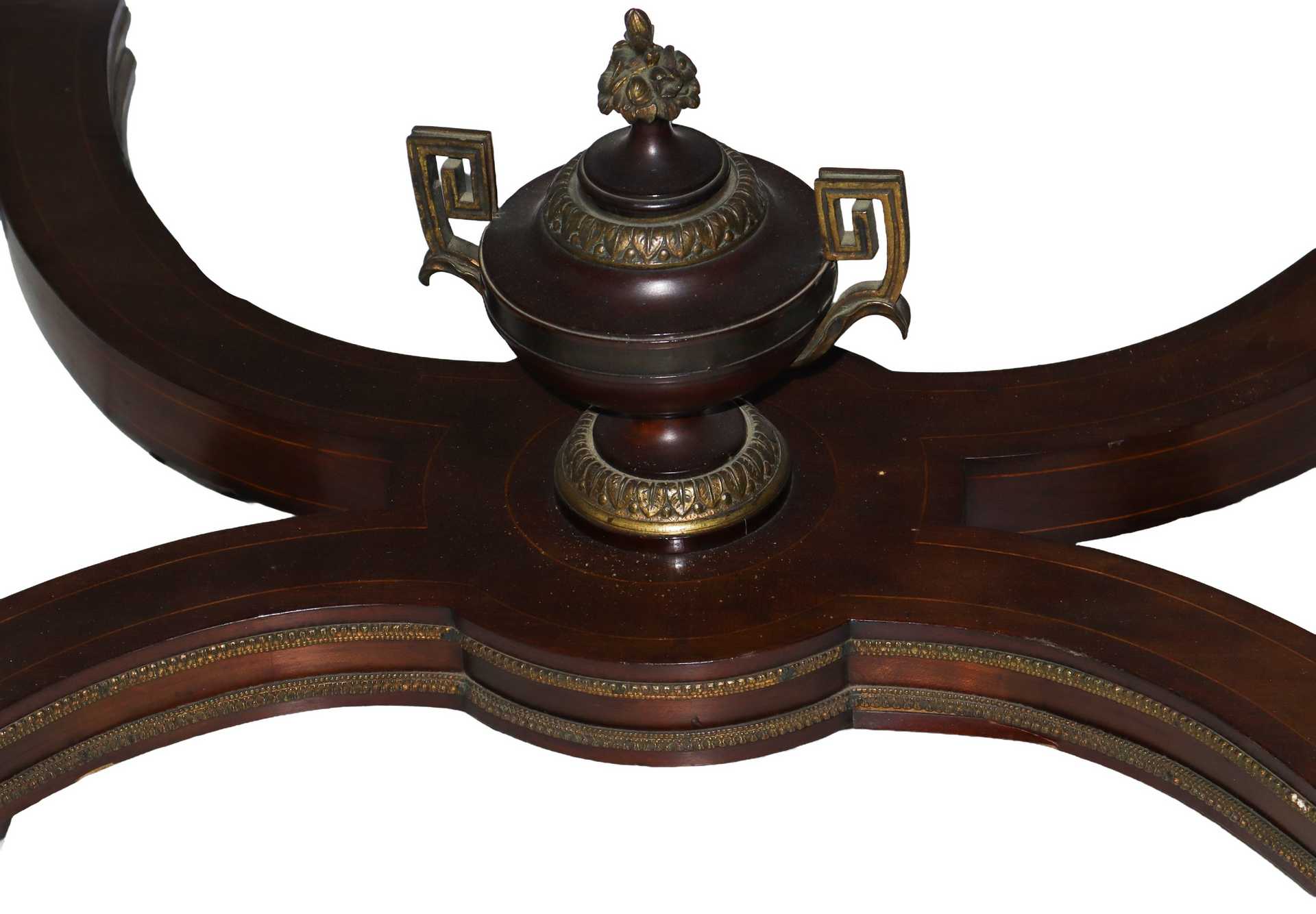 Bordo di sottopiano con bronzo applicati, quattro gambe congiunte al centro con vaso rinascimentale di congiunzione scolpito. Ottoni e bronzi applicati.