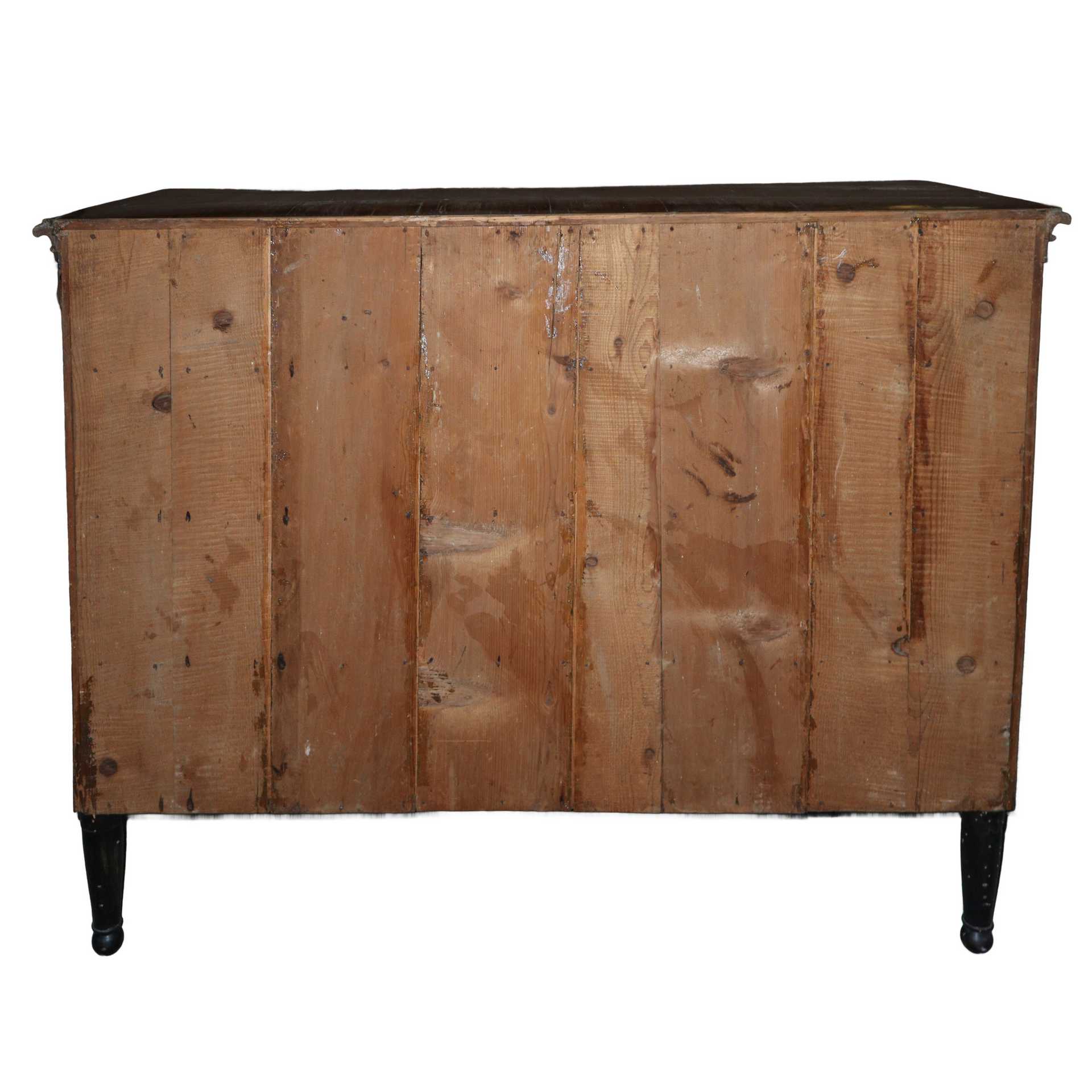 Cassettone a 4 cassetti in piuma di mogano con bocchette a losanga, testine in legno nero ebanizzato scolpite applicate ai lati , first half of the 19° secolo h cm 105X135X58