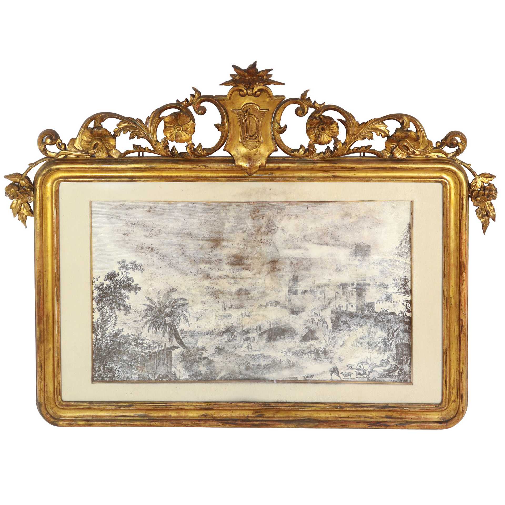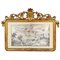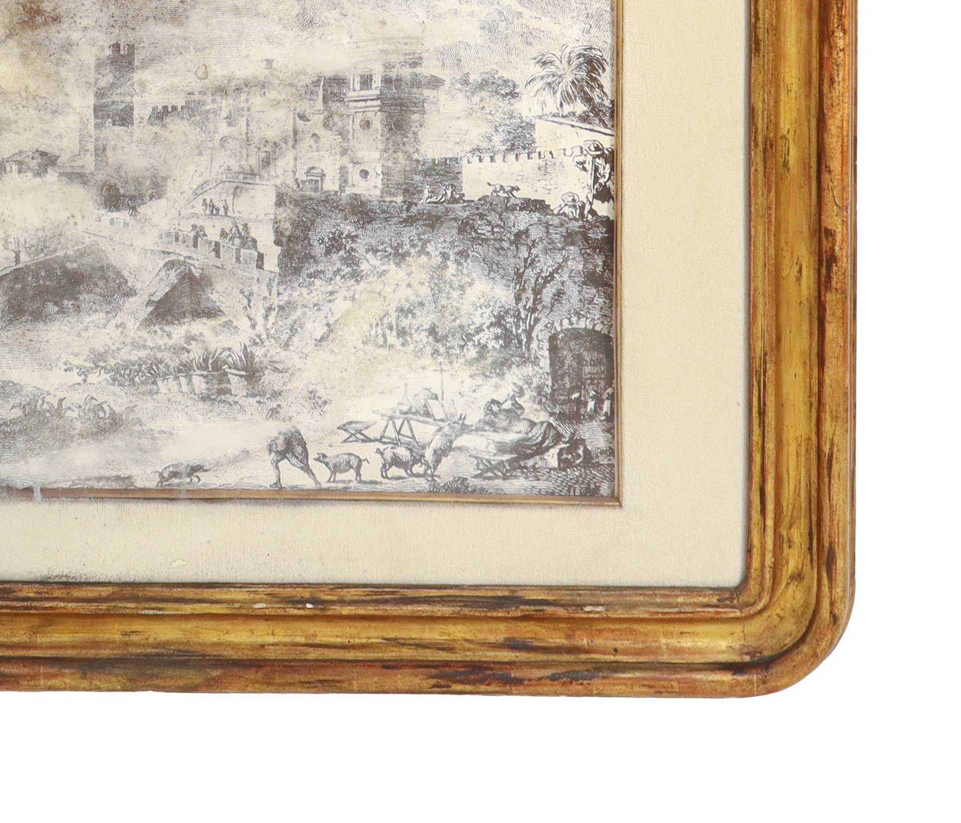 Grande Cornice dorata in legno con cimasa contenente acquaforte di città medievale