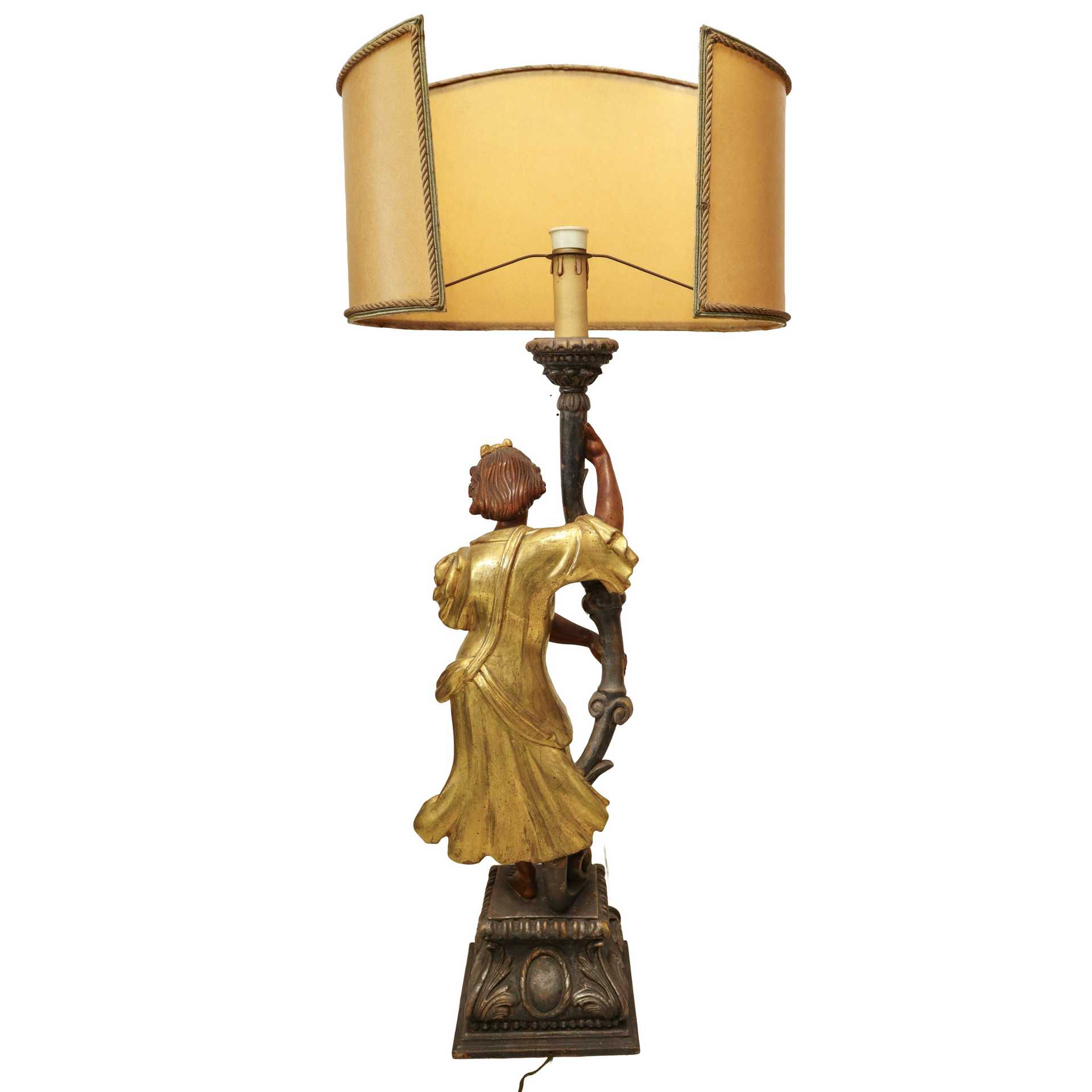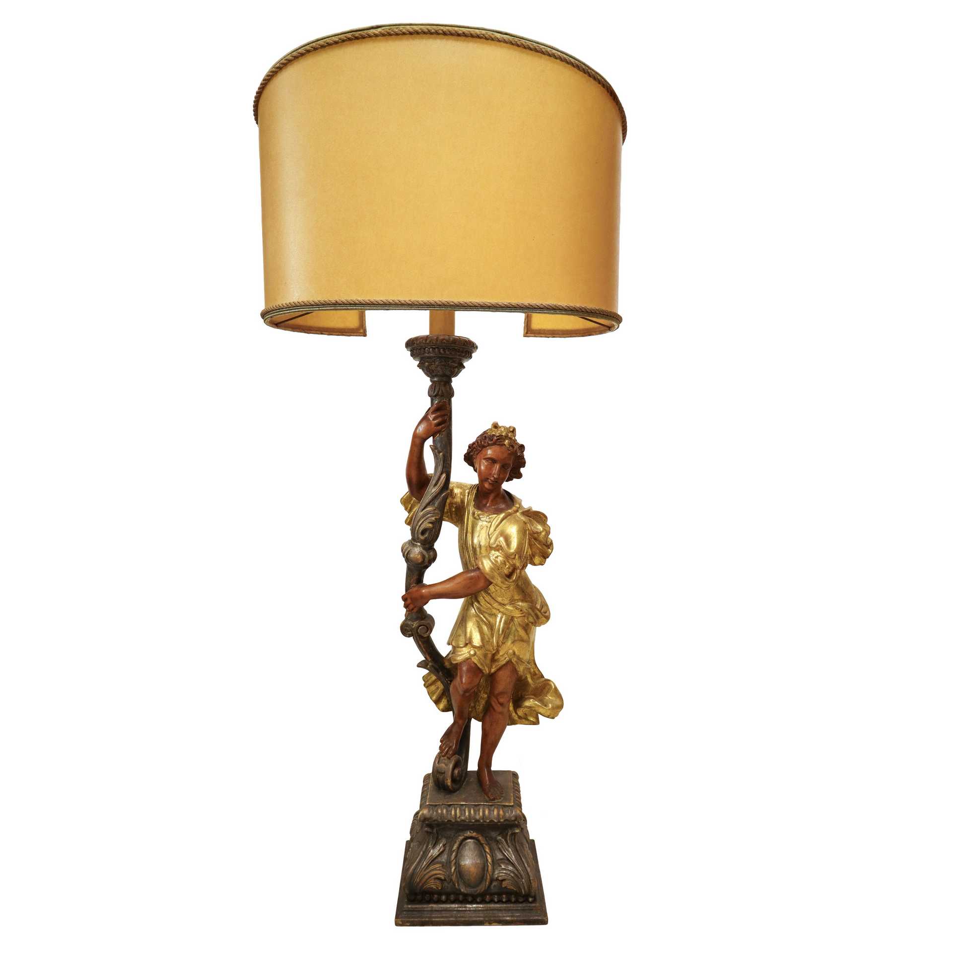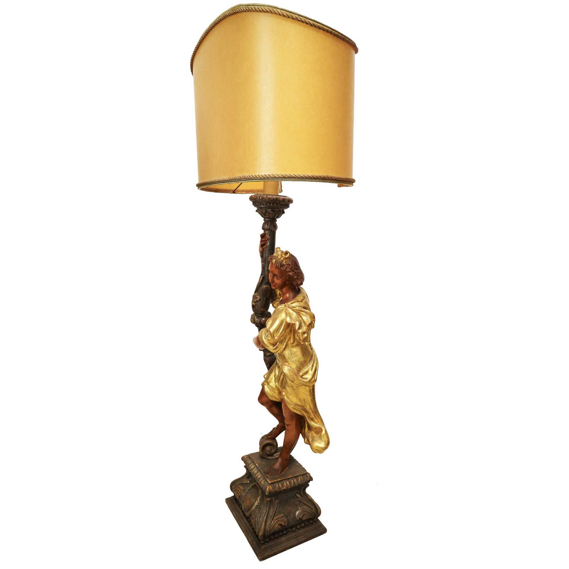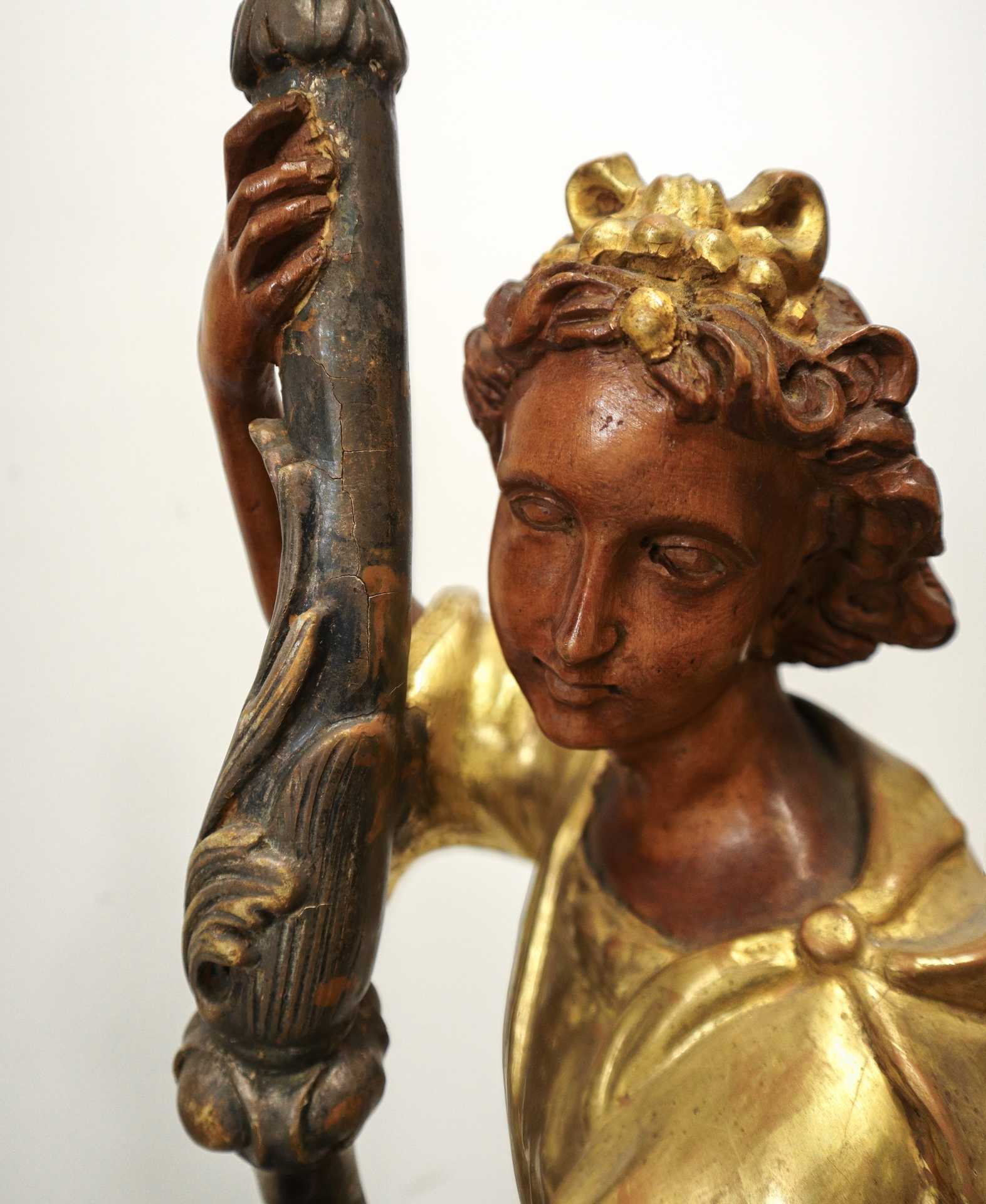 Lume con scultura policroma di angelo in legno dorato a foglia, Primi 20° secolo