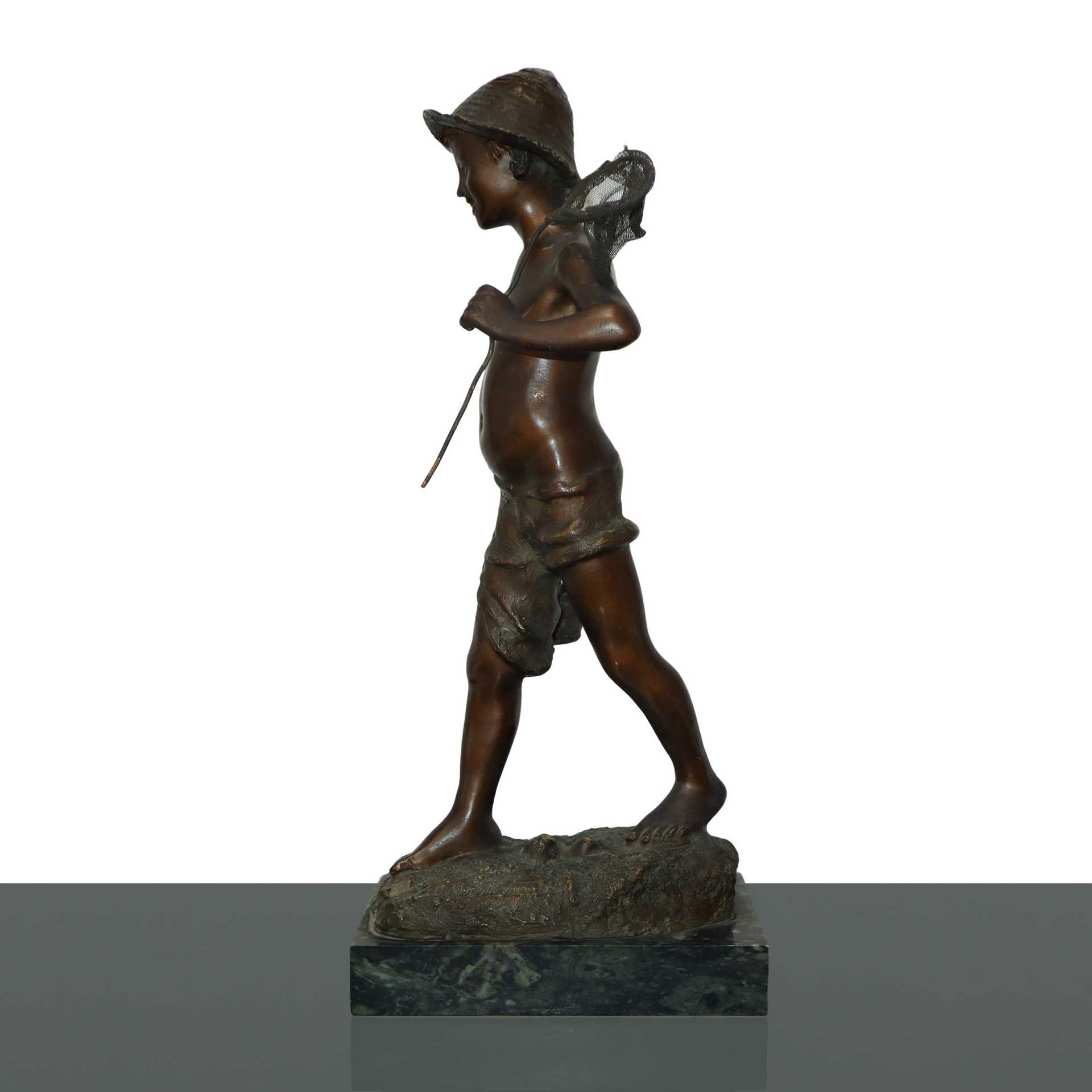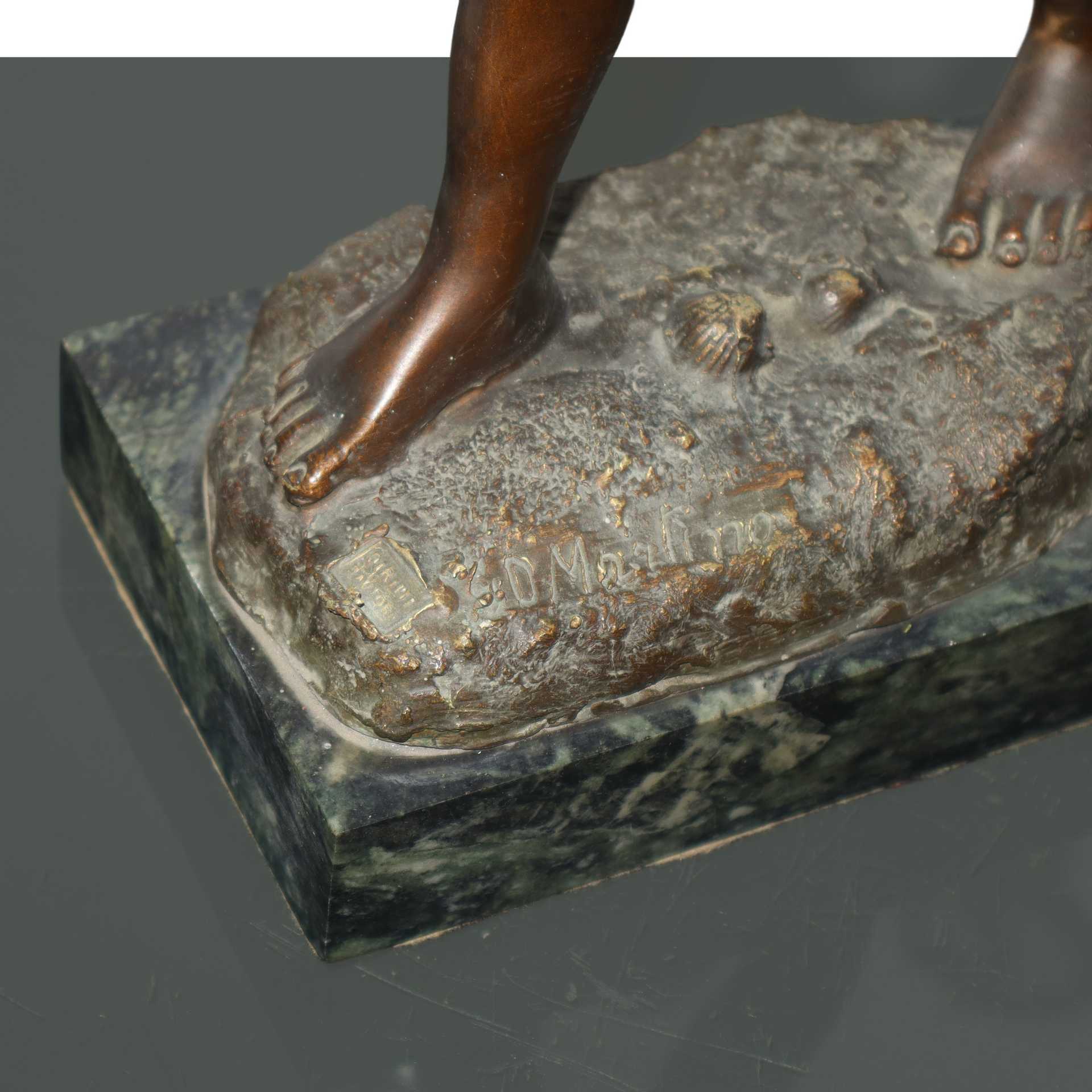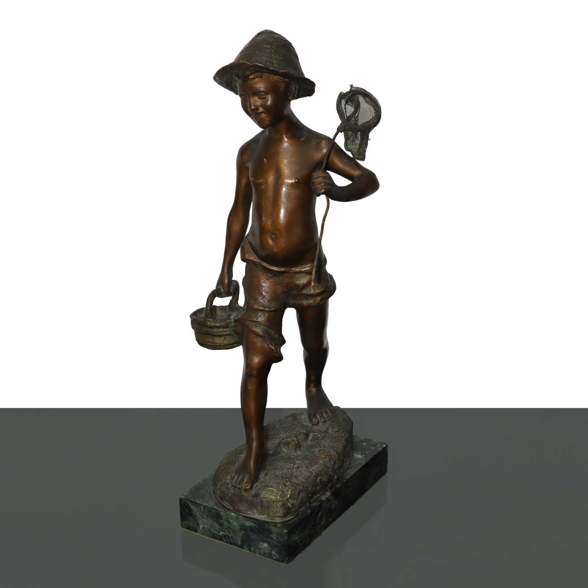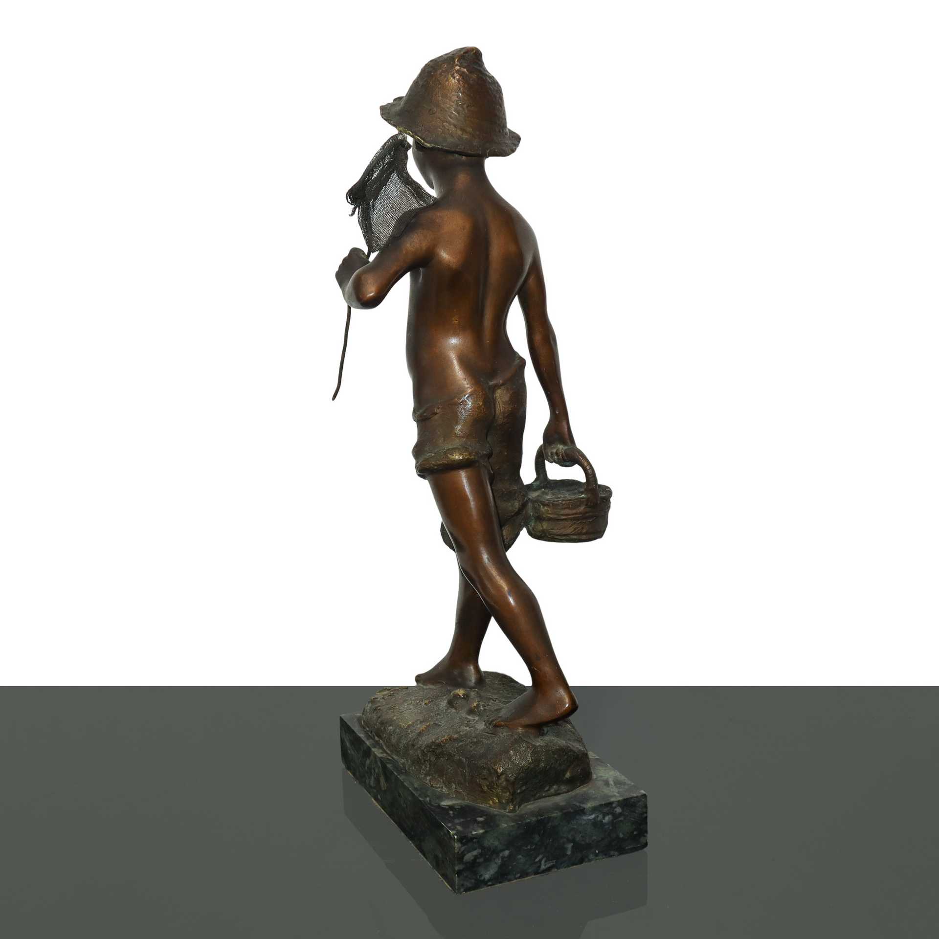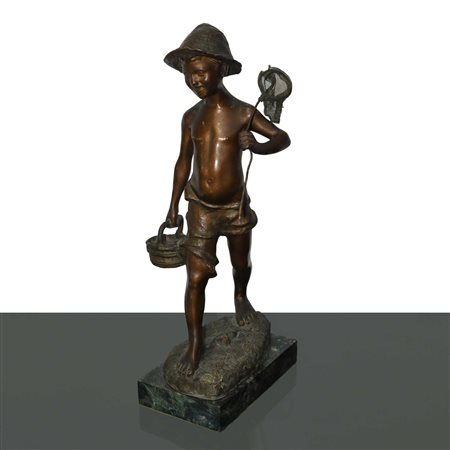 De Martino (Napoli 1870-Napoli 1935) - Pescatoriello in bronzo patinato bruno su base di marmo con cesto e retino, Fine 19° Primi 20° secolo h cm 42 base 3X11 Timbro e firma dell'autoreTimbro e firma dell'autore