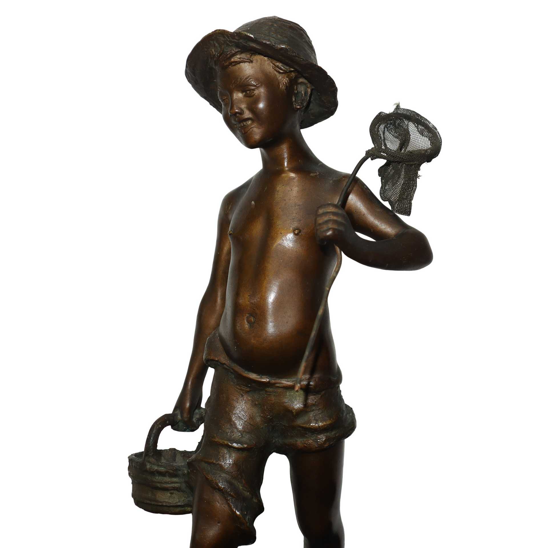 De Martino (Napoli 1870-Napoli 1935) - Pescatoriello in bronzo patinato bruno su base di marmo con cesto e retino, Fine 19° Primi 20° secolo