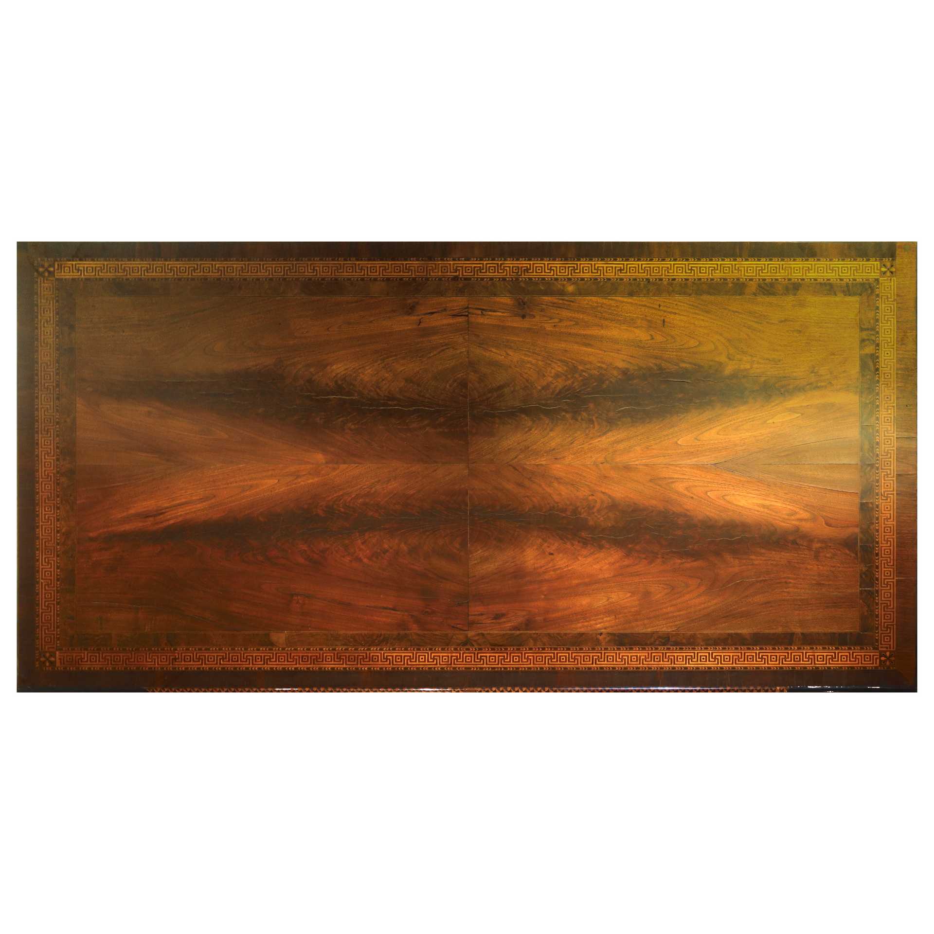 Tavolo Console in piano in piuma di mogano con greca perimetrale in legni chiari a contrasto., 19° secolo