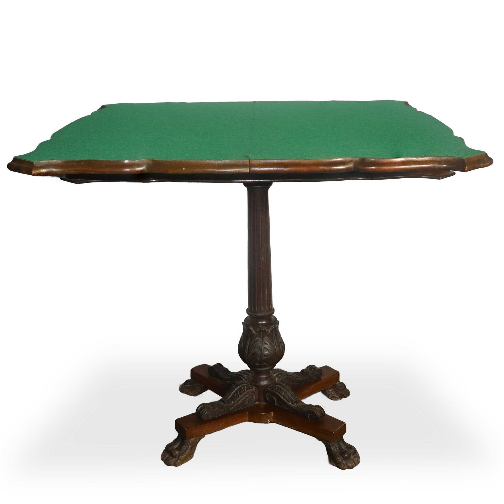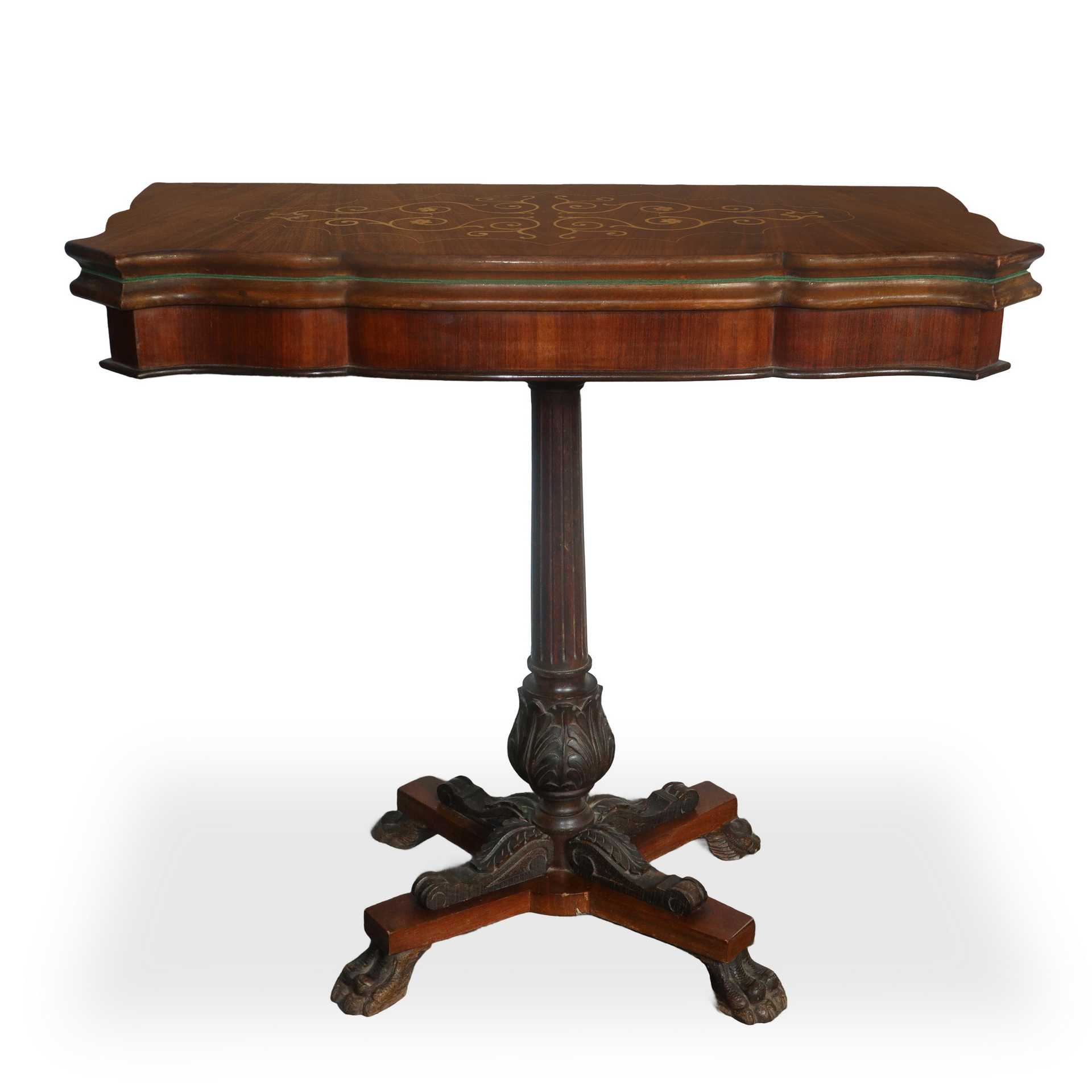 Tavolo da gioco in legno di palissandro con intarsi chiari al piano e piede a 4 razze, 19° secolo