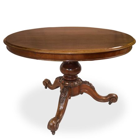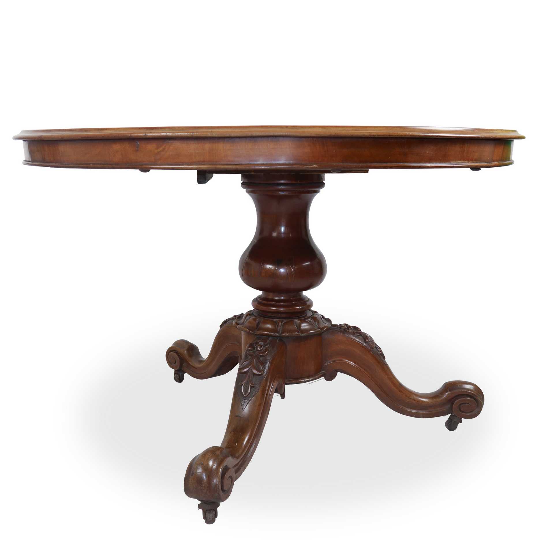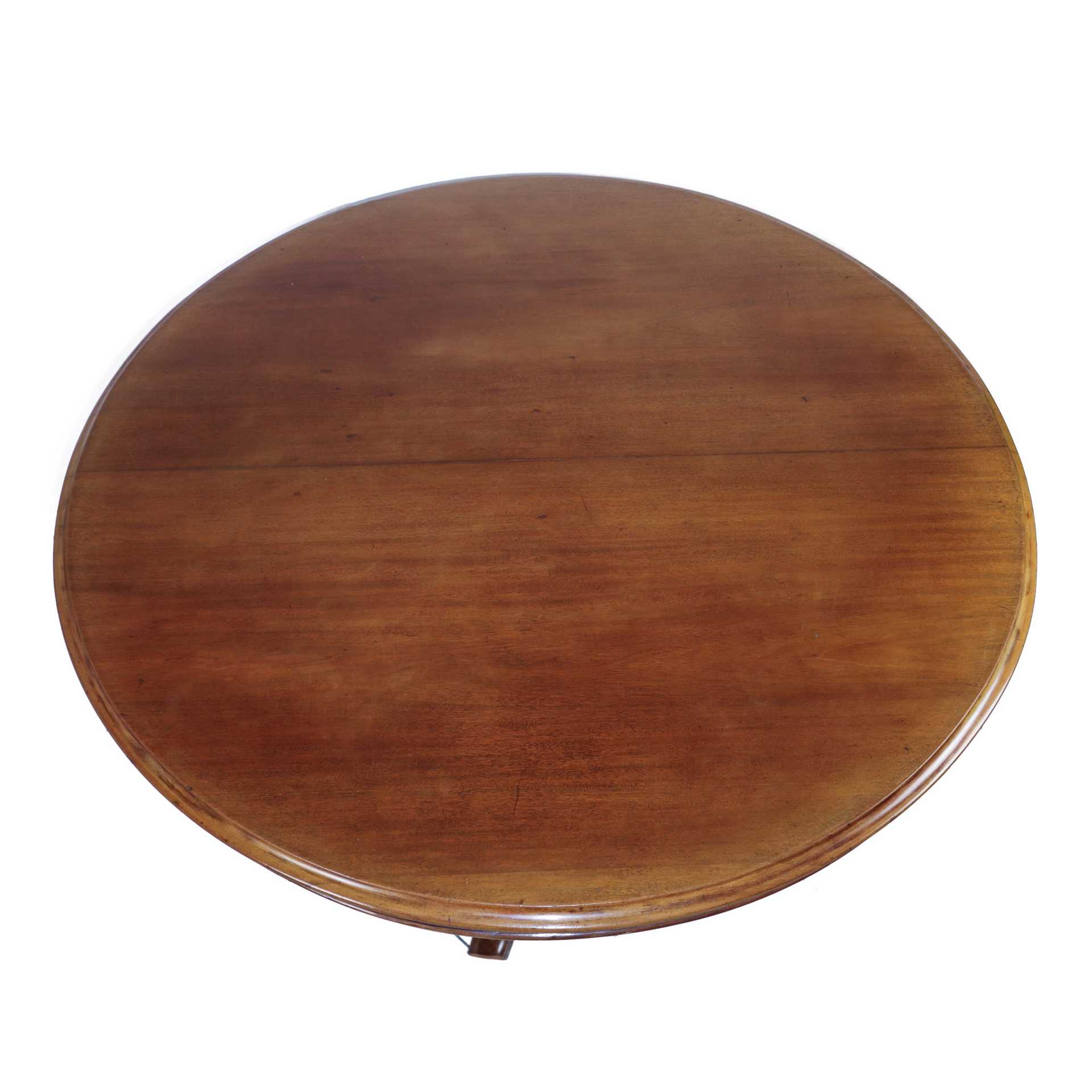 Tavolo da pranzo allungabile rotondo in legno di mogano piede a tre razze intagliato e scolpito a foglie , 19° secolo 79 x 118 x 120 cm