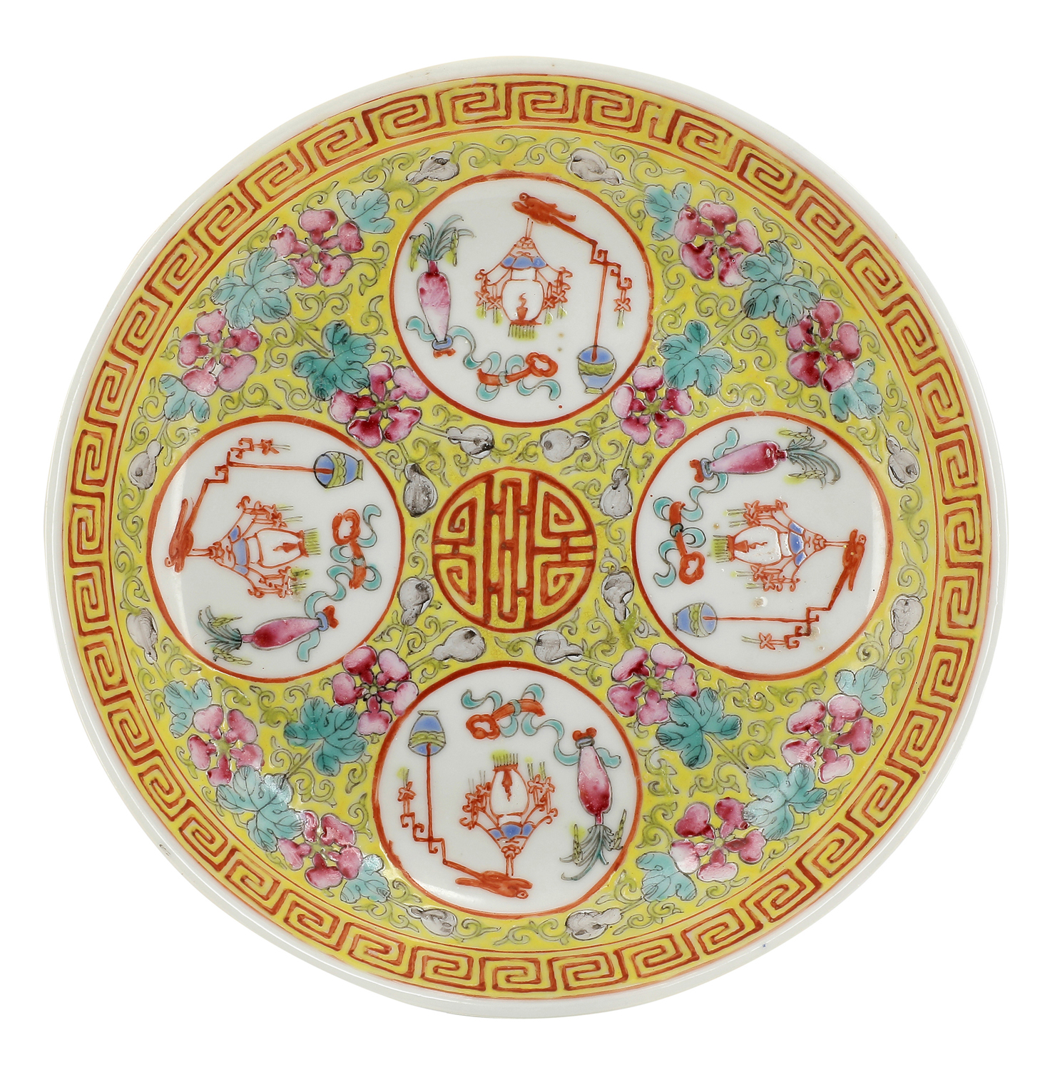 Sul fondo, stilizzazione del carattere shou, che indica la longevità. Per fattura il lotto sembra databile alla prima metà del XX secolo, ma non è stata effettuata alcuna datazione dei materiali attraverso strumentazione scientifica.