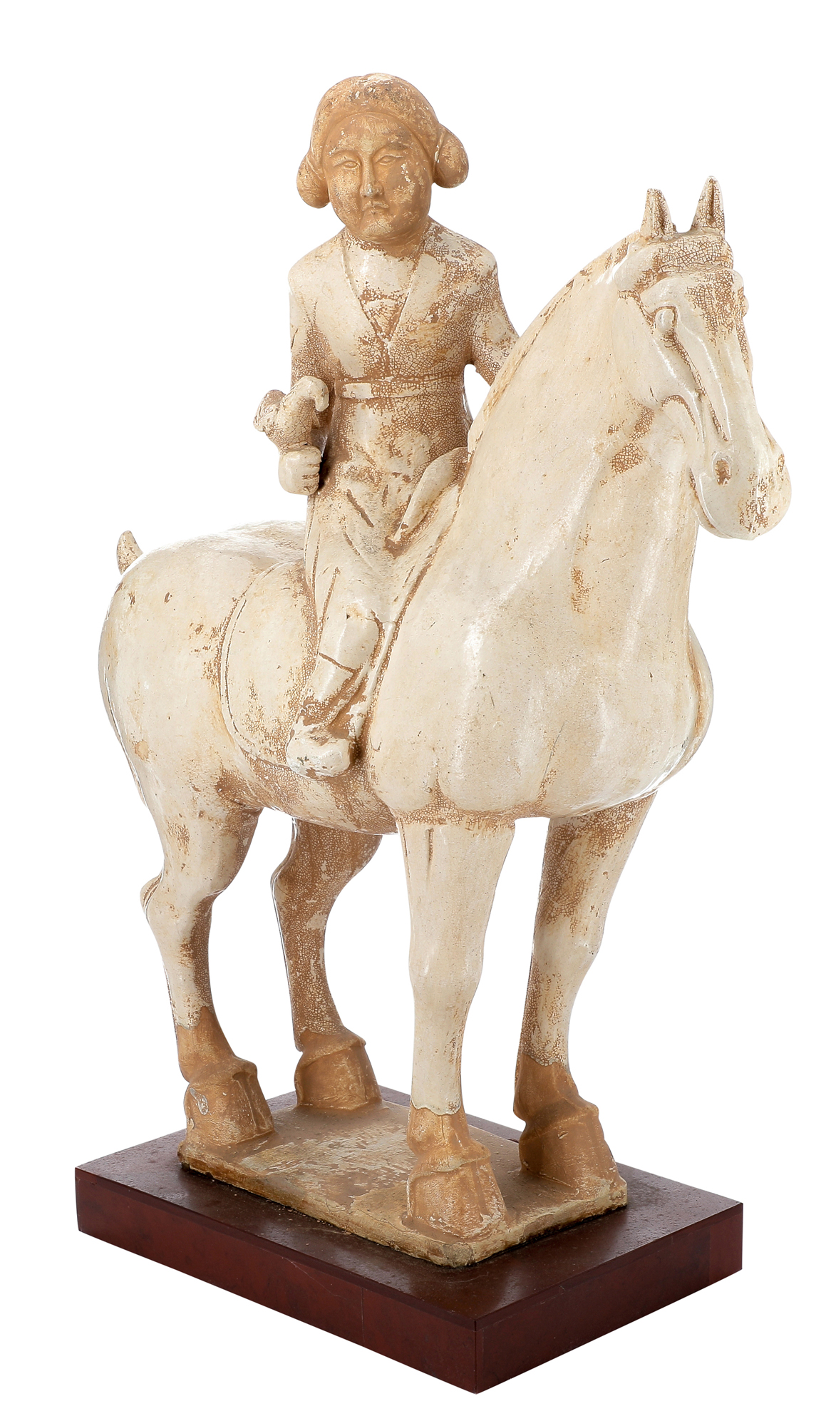 Amazzone con falco in terracotta caolinica con sottile vetrina, il lotto segue le movenze dello stile Tang del VII secolo. Come segnala Roberto Ciarla in base all'esame di foto ad alta definizione, le incrostazioni marroni e la crettatura a maglie molto nette e regolari suggeriscono che si tratti di una replica moderna, realizzata nel XX secolo (comunicazione del 2 novembre 2021).