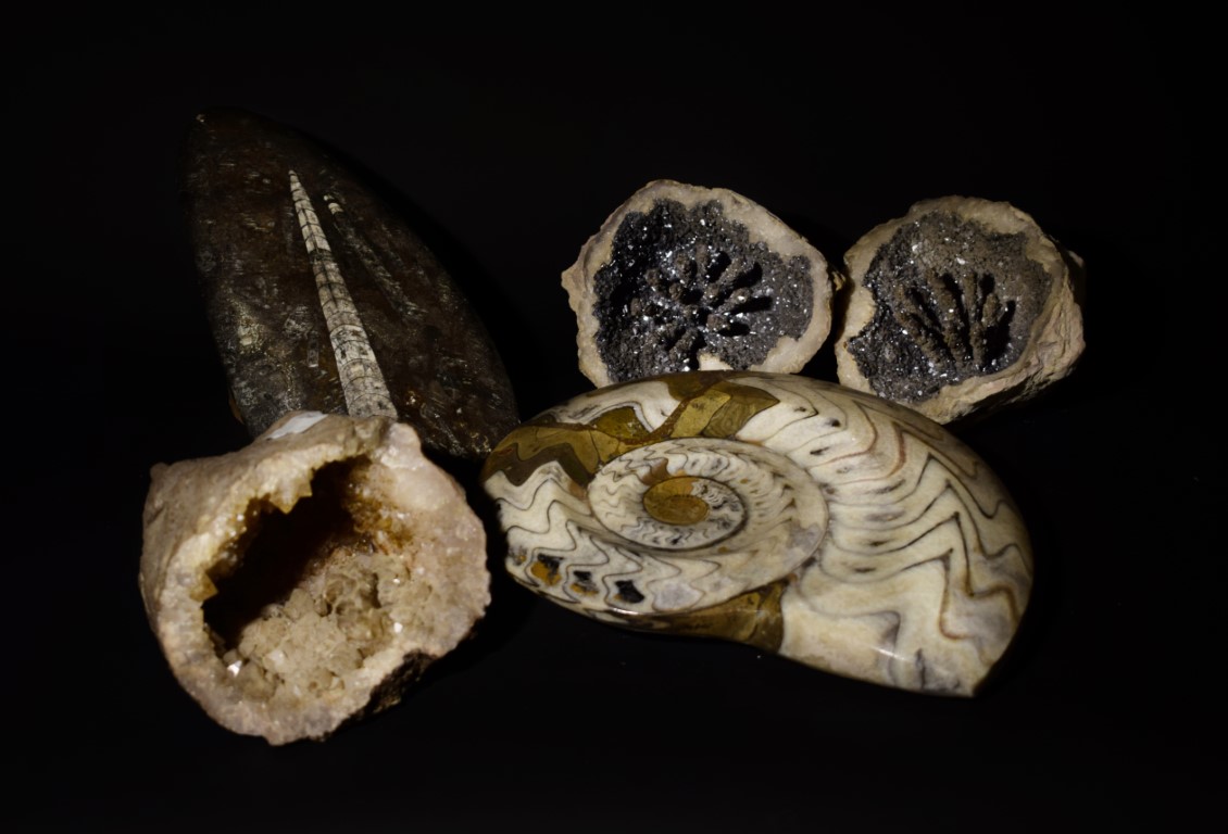 Lot composed of a large ammonite fossil, a pebble with orthoceras fossil and two geodes with different crystals.