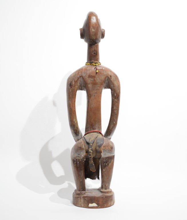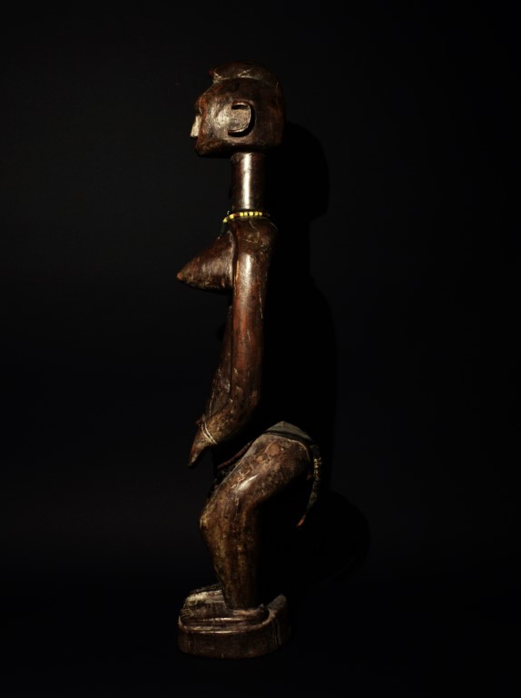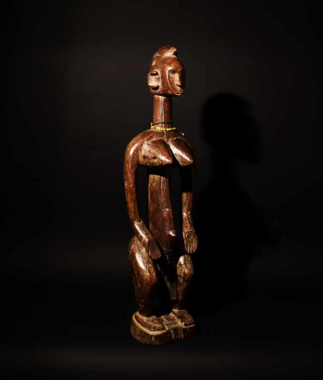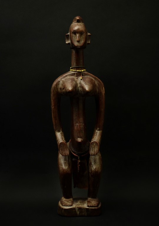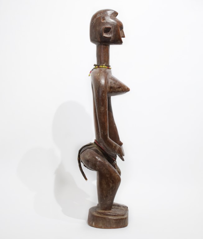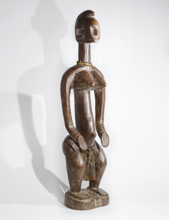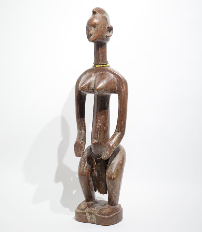 A fine and large sculpture depicting a standing figure of a woman. The slender body supported by slightly bent legs is characterized by large breasts, long arms, strong neck and a small stylized head.