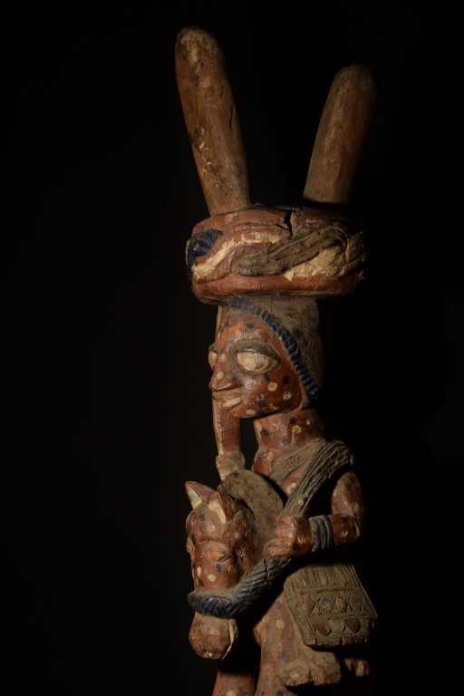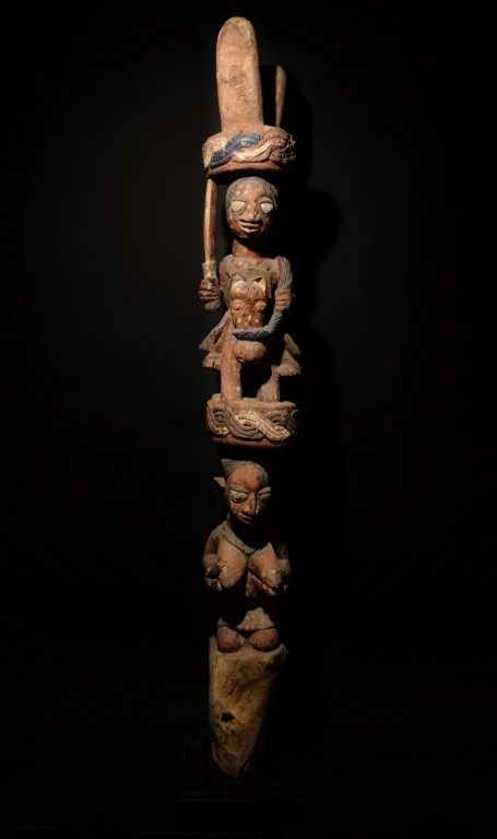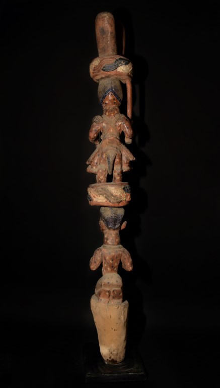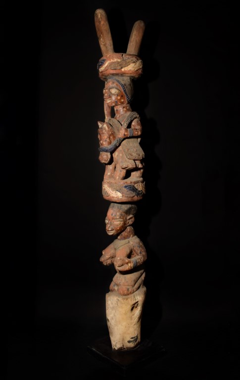 This large and heavy house post was supposed to be placed in the 'Afin' the palace of the village or in a sacred shrine to sustain the beam of the roof of the building. The complex carving of a single trunk of heavy iroko wood shows some of the typical subjects connected to the Yoruba tradition painted in bright colours. Subjects such as the horse raider and the kneeling mother can be observed in other important artefacts such as the complex and imaginative masks used in the Epa society cult connecting both in ancestor and agriculture.