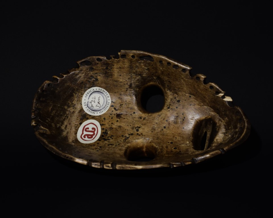 Carved wood with shiny black patina and traces of encrusted patina with kaolin around the eyes.