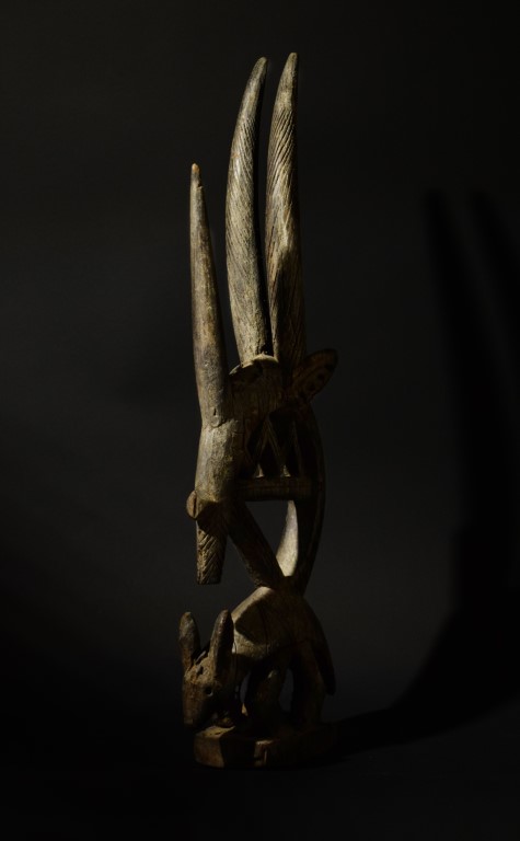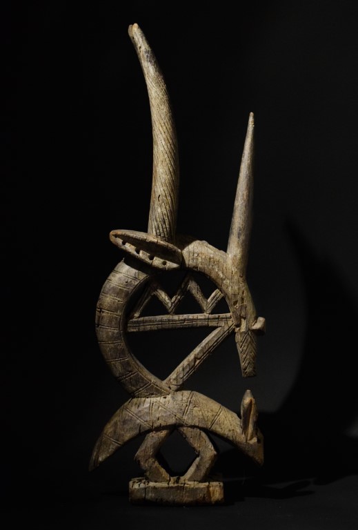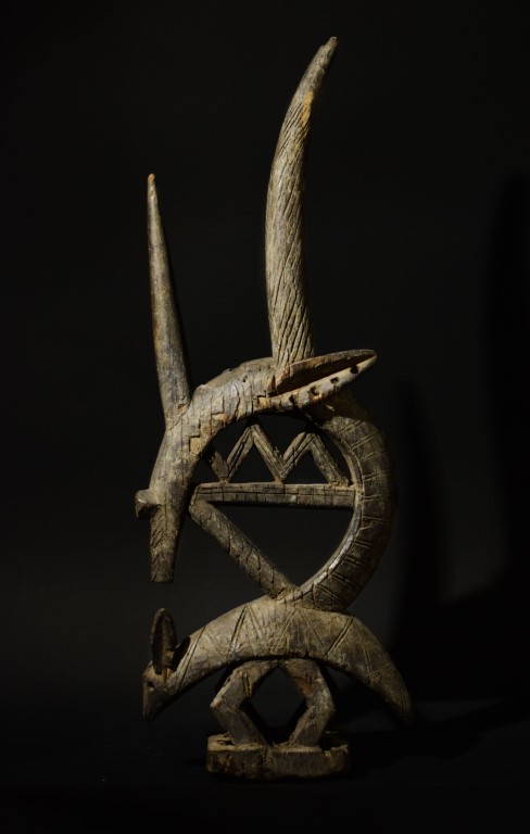 The zoomorphic wood crest depicts Chiwara, a mythical creature that taught humankind to farm and take care of the land. In Chiwara the forms of various animals such as the antelope, the tapir and the anteater can be recognized, merged in a chimera-like appearance.