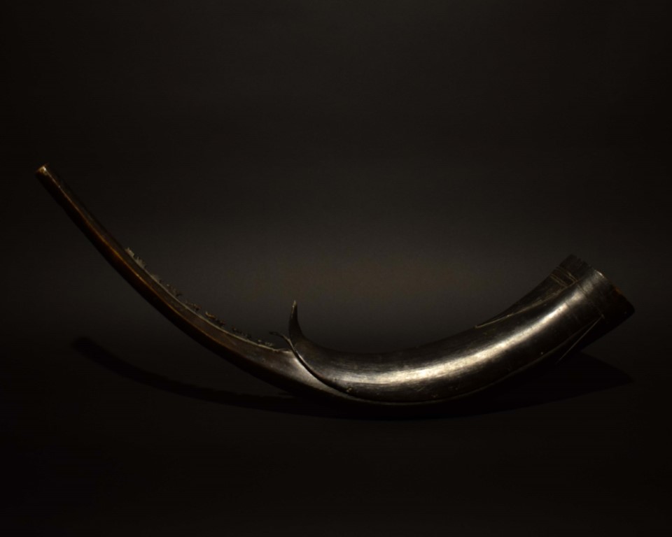 The natural shape of the large and slender horn of the water buffalo is enriched by a sober decoration with hot-bent elements to create an elegant container, probably a 'Naga Morsarang'.