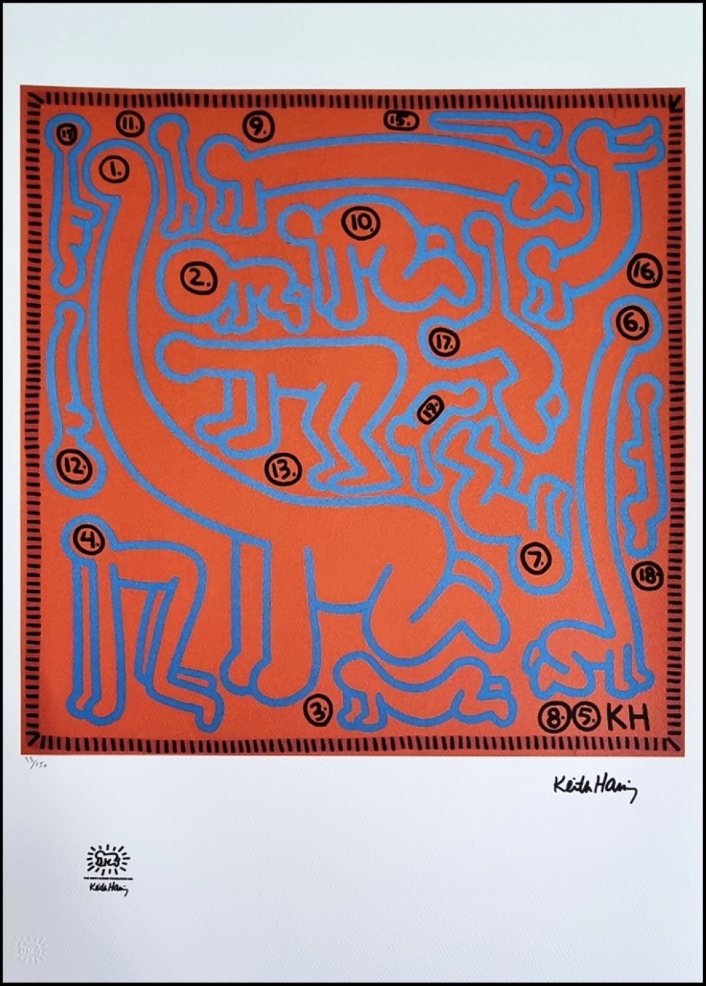 HARING KEITH Pennsylvania 1958 - New York 1990 "Senza titolo" Riproduzione litografica offset cm 50x70. Firma in stampa sul fronte in basso a destra, tiratura 33/150, timbro a secco e timbro in stampa a sinistra.