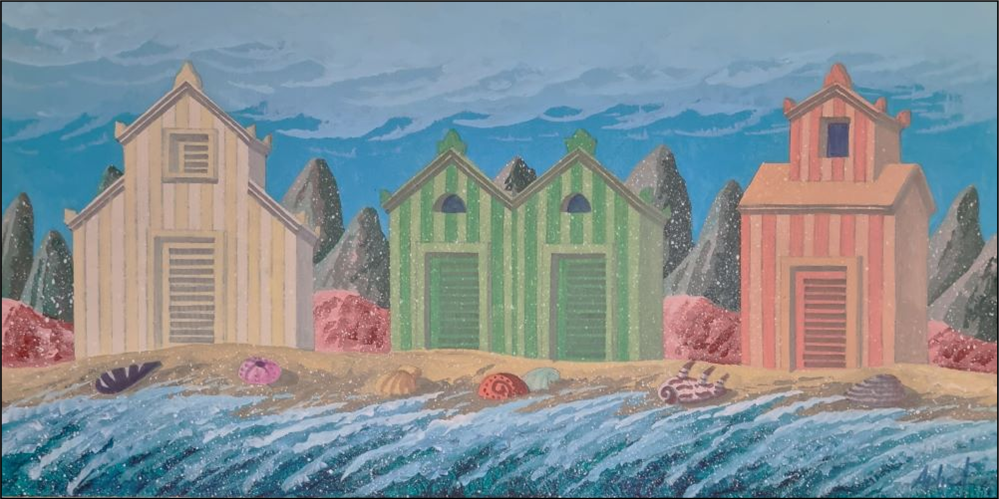 APHEL FABIO Cavalese (TN) 1957 "I capanni" Olio su tavola cm 40x20. Firmato sul fronte in basso a destra. Al verso firma e titolo.