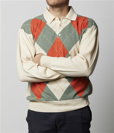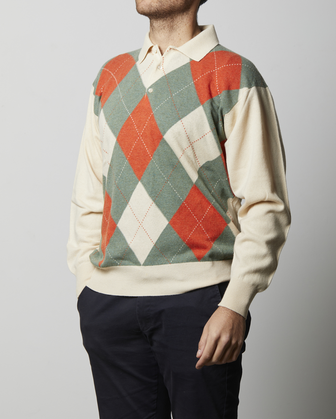 BALLANTYNE Maglione polo. cashmere. . Maglione polo Ballantyne, colletto con tre bottoni, fantasia logo a scacchi terracotta, verde giada su fondo color avorio. Spalla 45 cm, vita 53 circa. Taglia L. Etichetta Ballantyne.