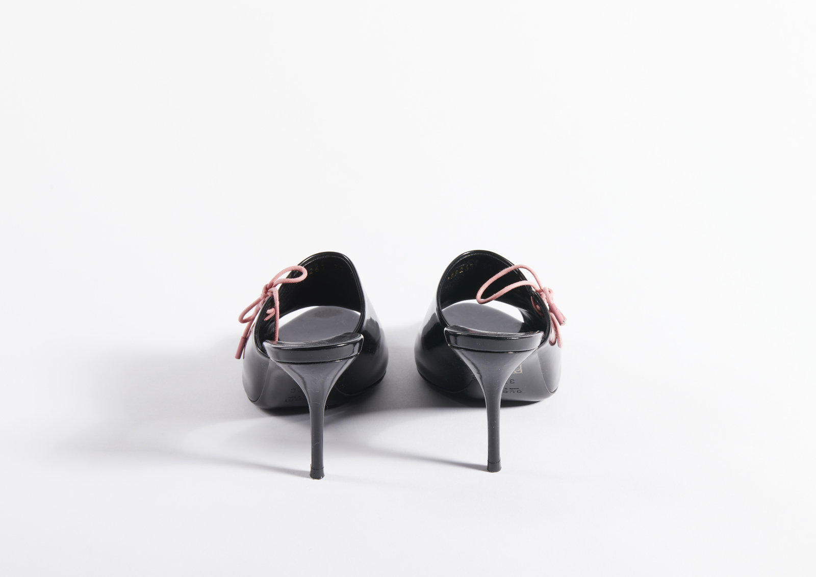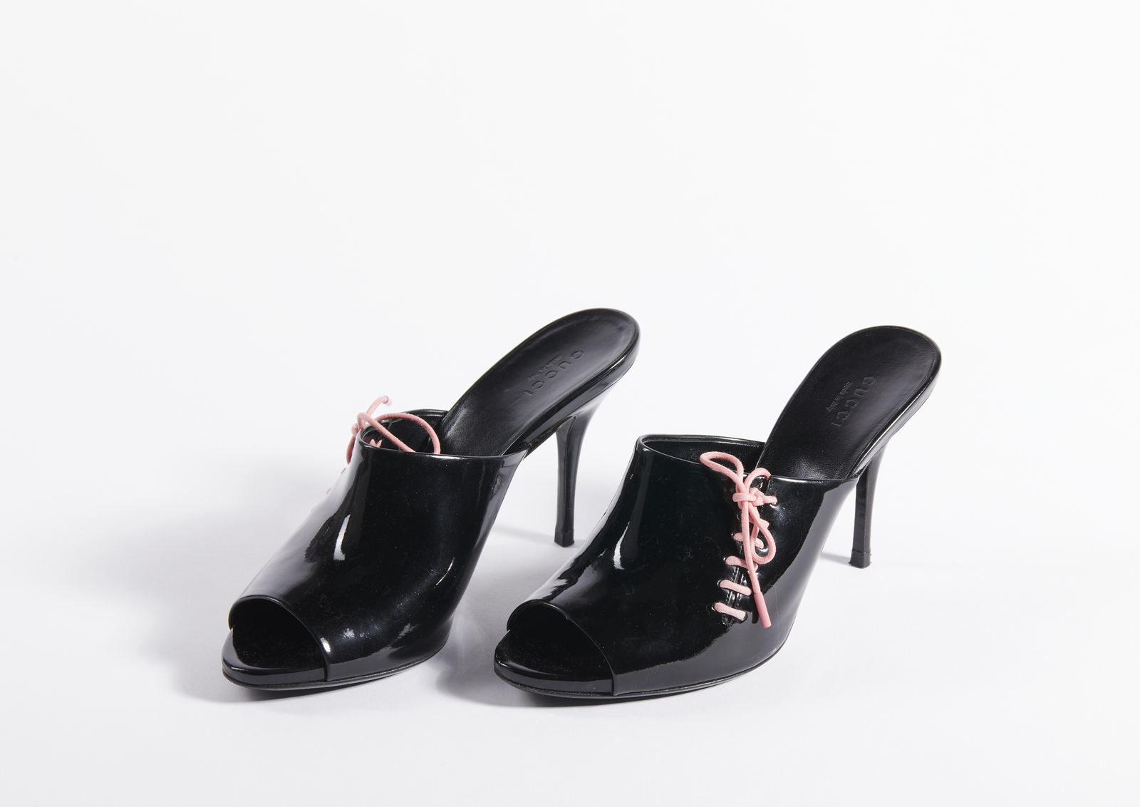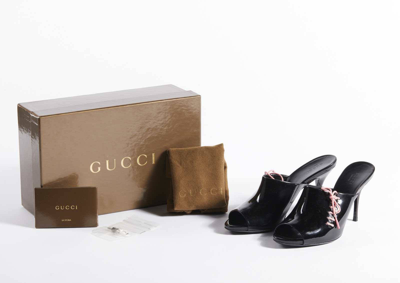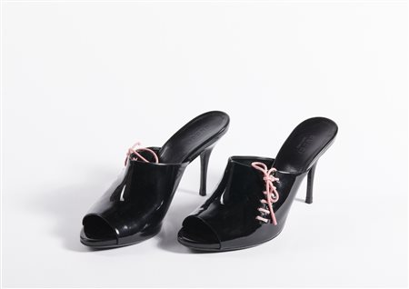 GUCCI Sandalo in vernice nera. Pelle. Cm 27,00. Scarpe peep-toe in pelle nera verniciata con dettaglio allacciatura rosa, presenta ricambio per tacchi. Taglia 37IT. Tacco 8 cm