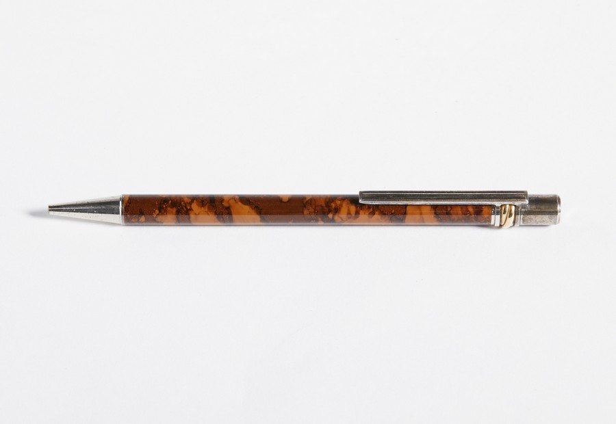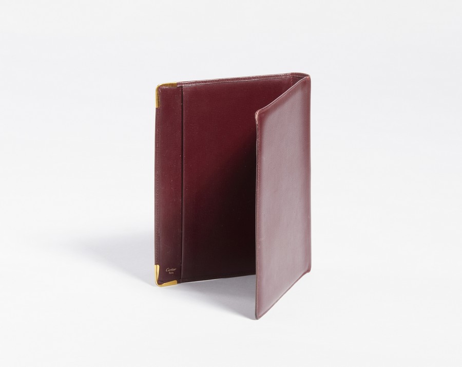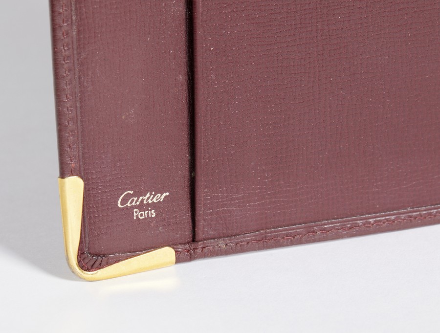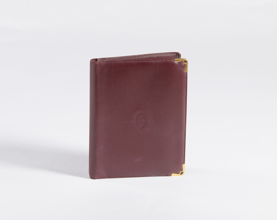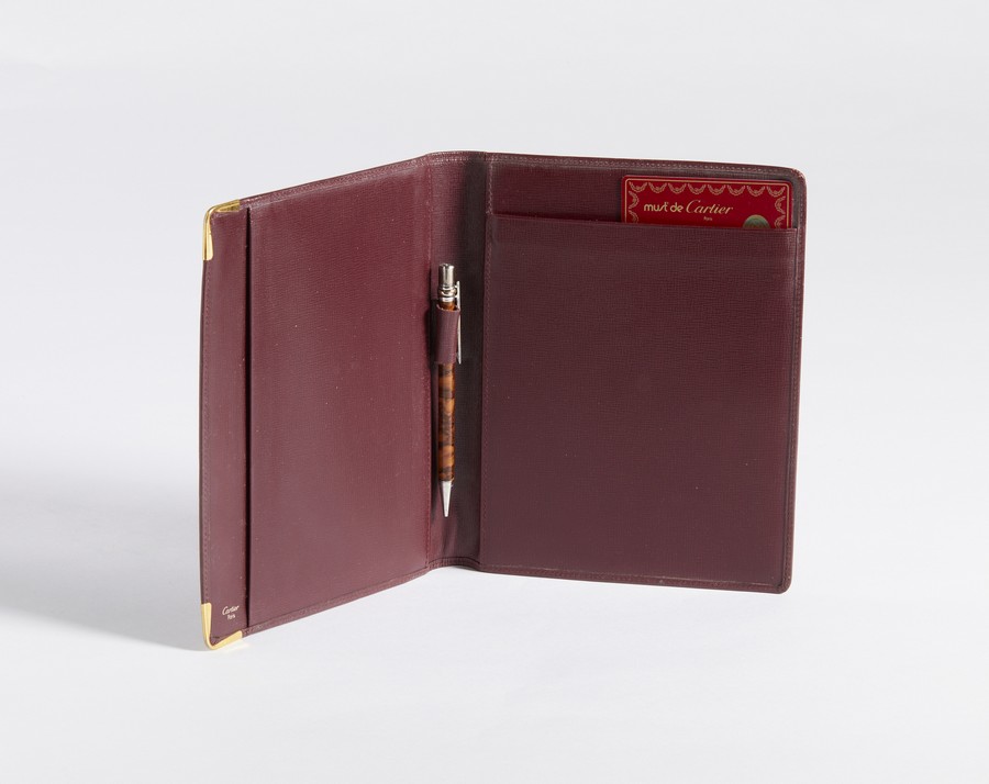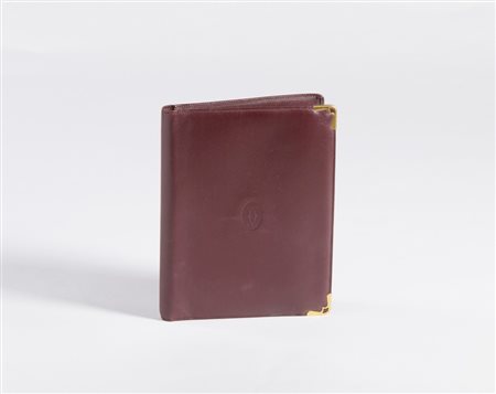 CARTIER Custodia per bock notes. Pelle. Cm 17,50 x 22,00. Custodia per bolck notes in pelle bordeux con logo al fronte, penna a sfera in argento e resina modello Trinity