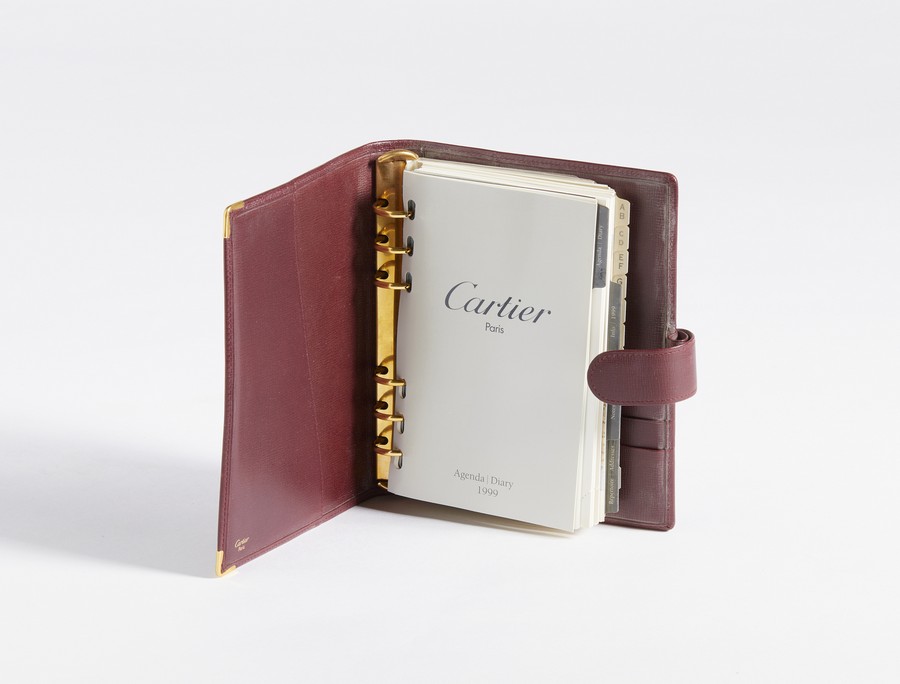 CARTIER Custodia per agenda pelle bordeaux. 1999. Pelle. Cm 15,00 x 19,00. Agenda in pelle bordeaux con logo sul fronte e agenda originale Cartier datata 1999