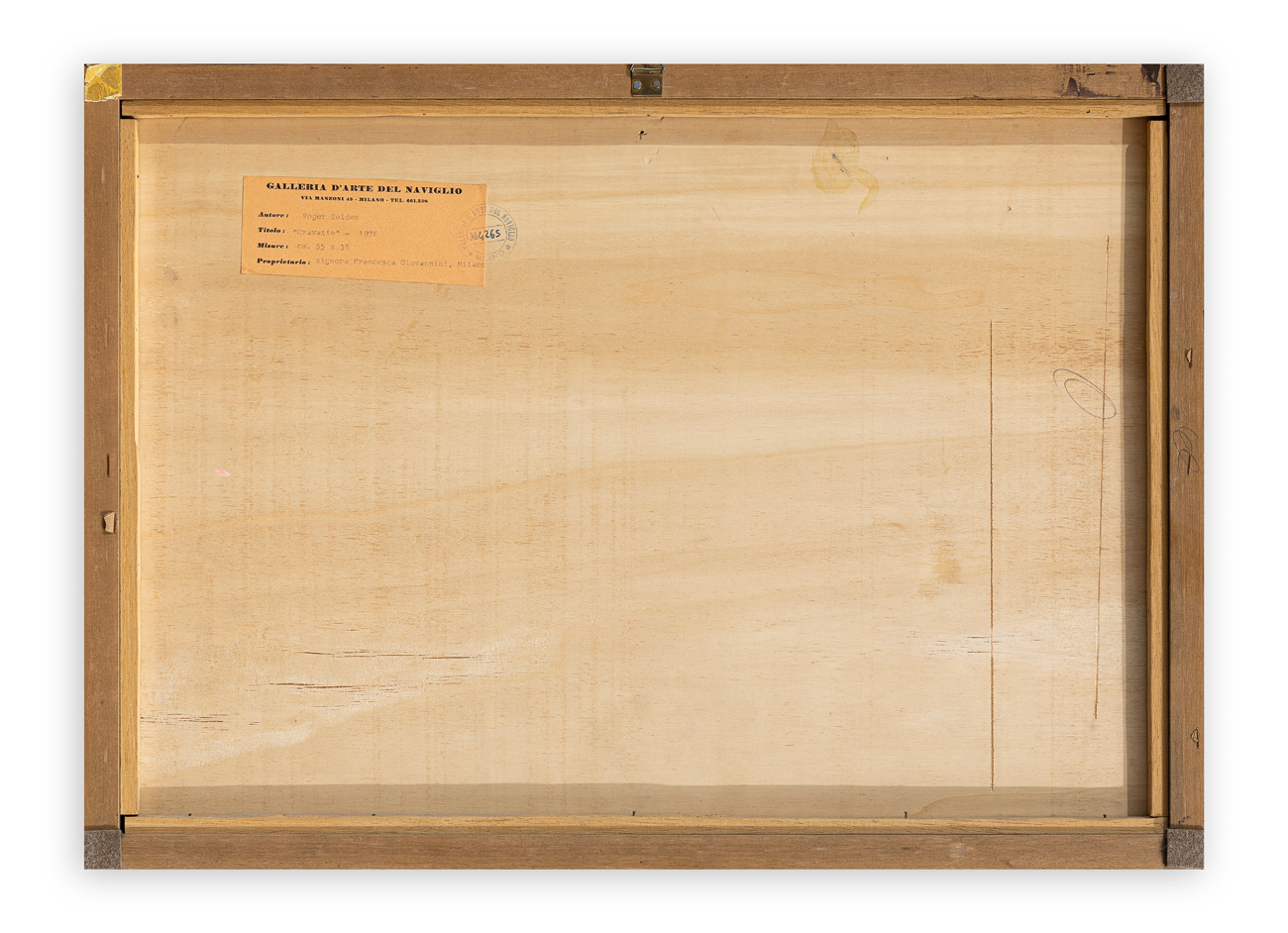 Etichetta e timbro della Galleria d'Arte del Naviglio (MI) con caratteristiche tecniche dell'opera al retro