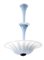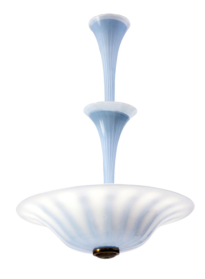 Lampadario a campane rovesciate in vetro incamiciato lattimo e azzurro.