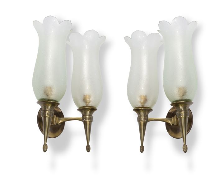 Coppia di lampade da parete con struttura in ottone e diffusori in vetro corroso.