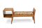 Panca portagiornali in legno di frassino, tessuto imbottito e piani in vetro.