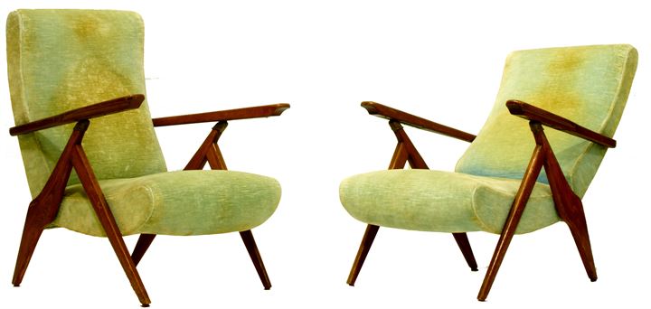 Coppia di poltrone reclinabili con struttura in legno ed imbottitura rivestita in tessuto.