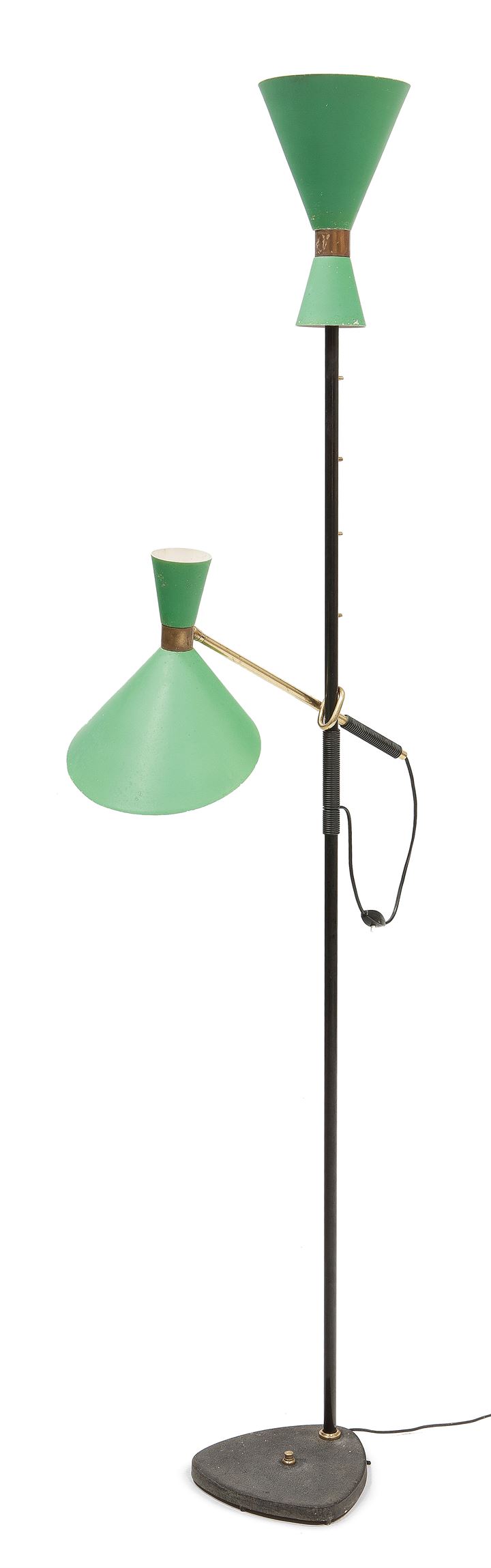 Lampada da terra in ottone, metallo verniciato e alluminio verniciato.