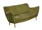 Divano in tessuto imbottito e supporti in legno e ottone.