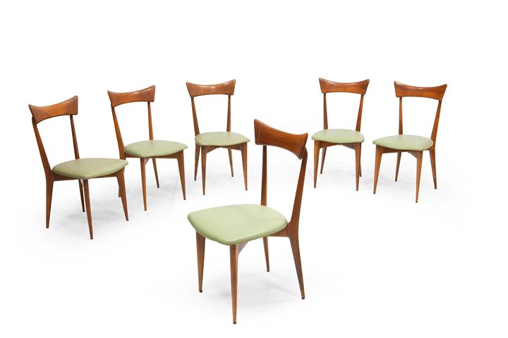 PARISI ICO Sei sedie in legno di mogano e skai imbottito. Prod. Ariberto...