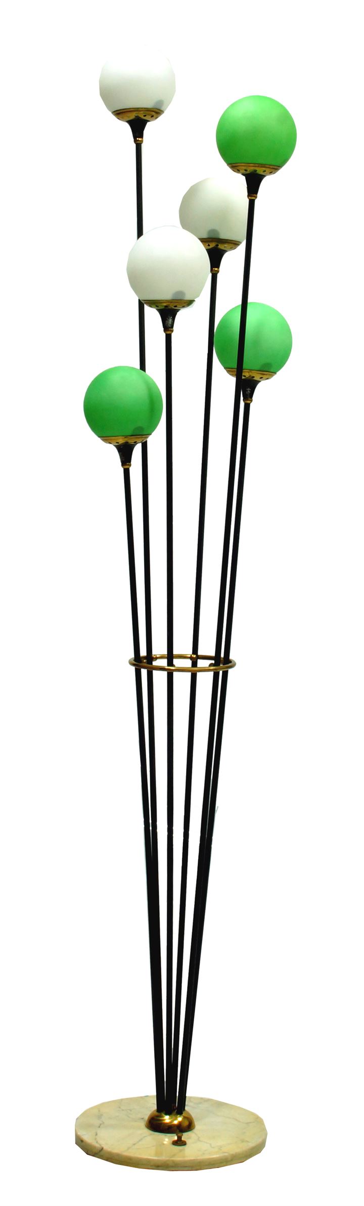 Lampada da terra in metallo laccato, diffusori in vetro opalino.