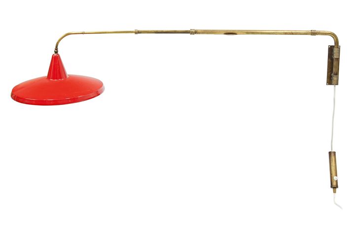 Braccio telescopico orientabile in ottone lucido, contrappeso e diffusore in lamiera laccata.