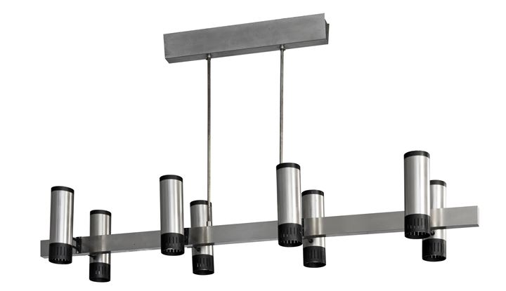 Lampada a sospensione in acciaio satinato e metallo laccato.