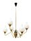 Lampada a sospensione in ottone e metallo laccato, diffusori in vetro satinato.