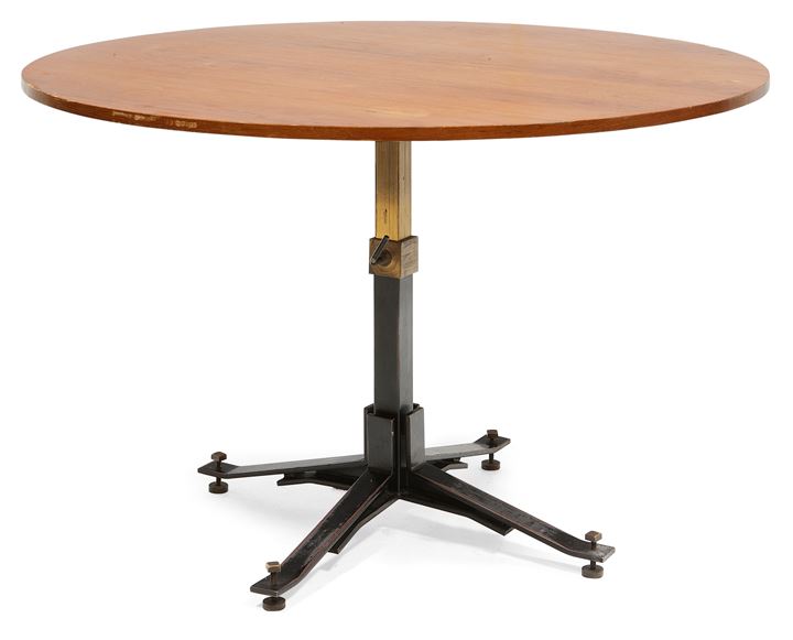 Tavolo con piano in compensato, meccanismo telescopico e metallo laccato.