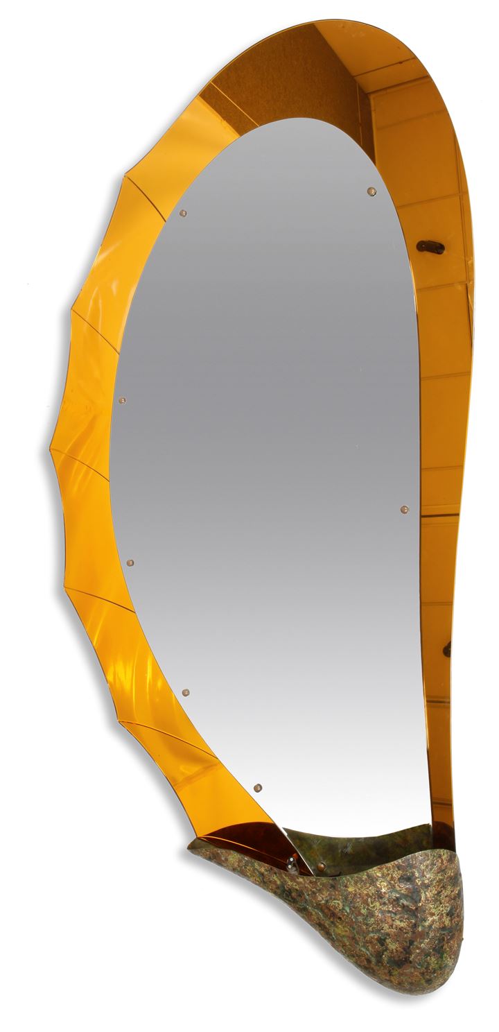 Specchiera con mensola illuminata, cornice in vetro specchiato colorato e molato, vetro specchiato e ottone lucidato.