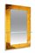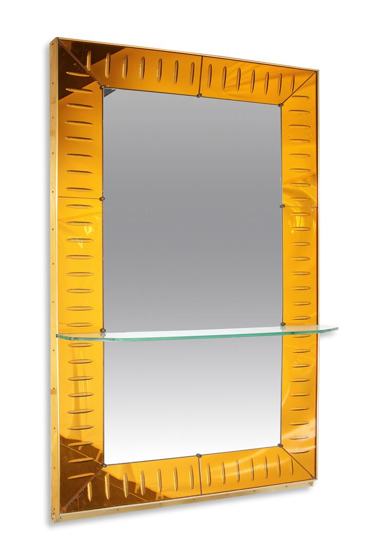 Specchiera con mensola, cornice in vetro specchiato colorato e molato, vetro specchiato e ottone lucidato.