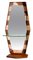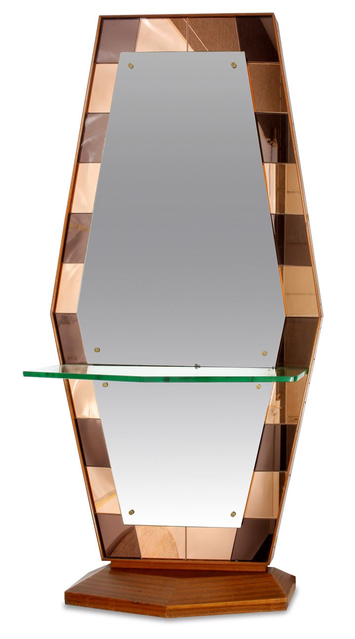 Grande specchiera con mensola, cornice in legno e vetri colorati e molati.