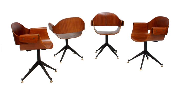 RATTI CARLO Quattro sedie in compensato di teak curvato. Gambe in metallo...