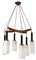 Lampada a sospensione con struttura in metallo laccato, ottone ed elementi in vetro satinato.