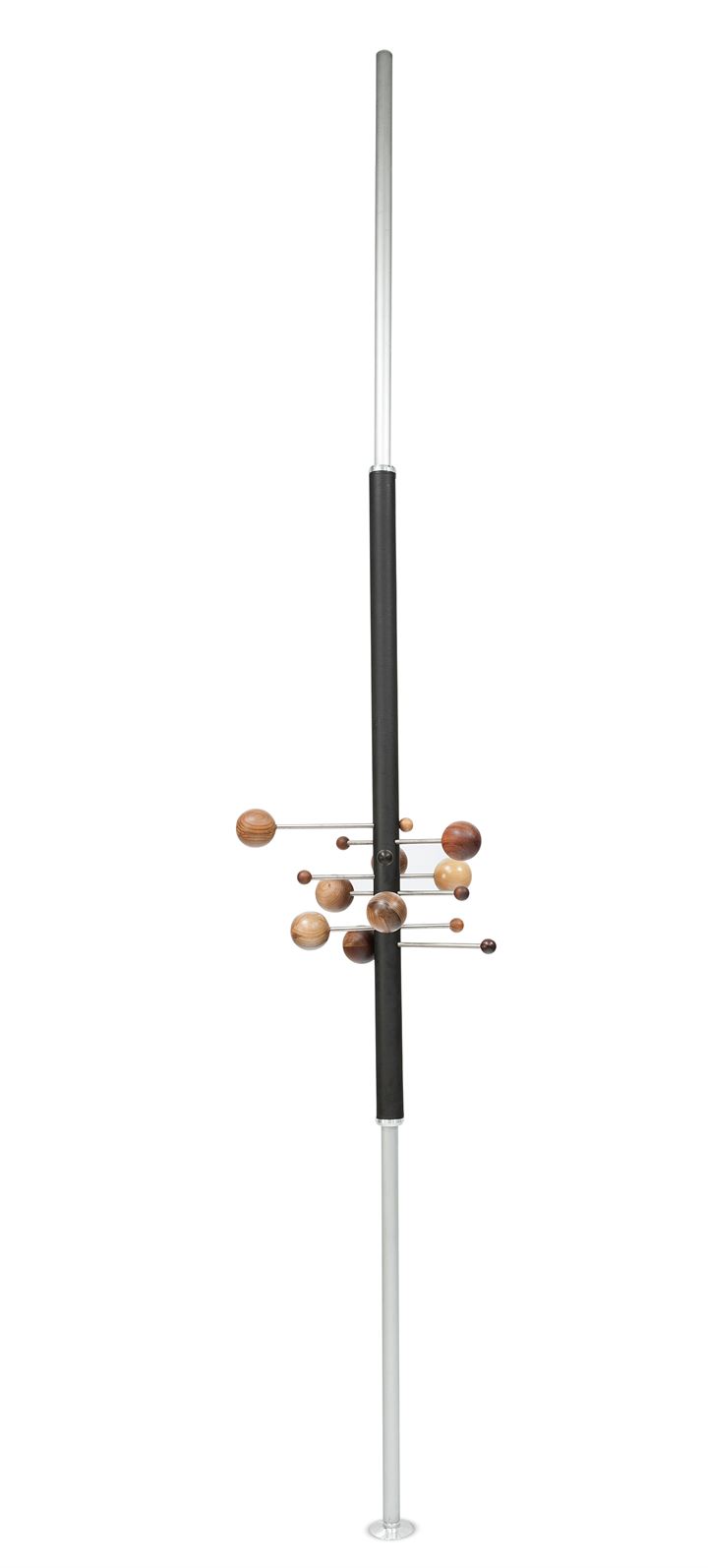 Appendiabiti a colonna in metallo verniciato, pelle e legni diversi.