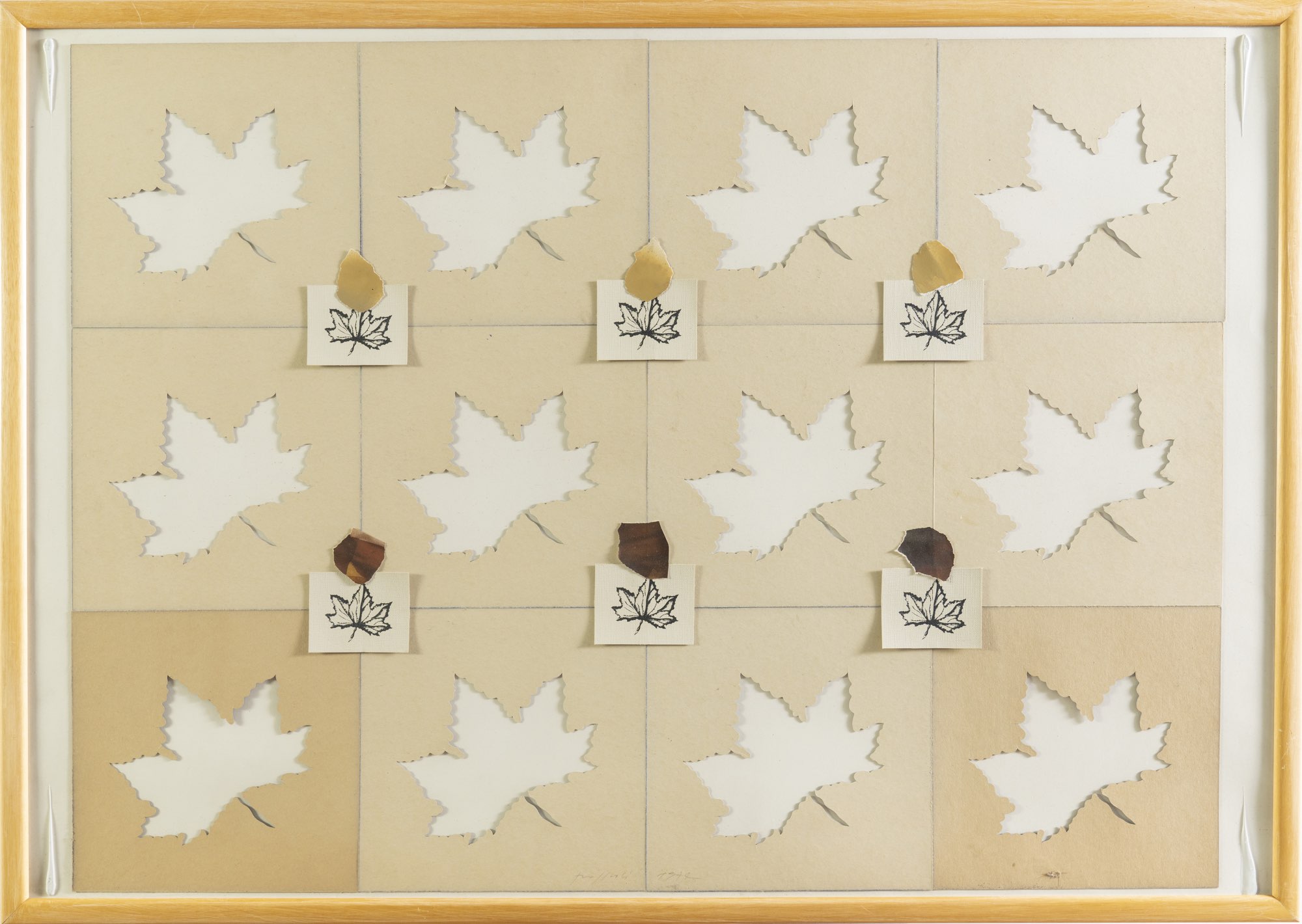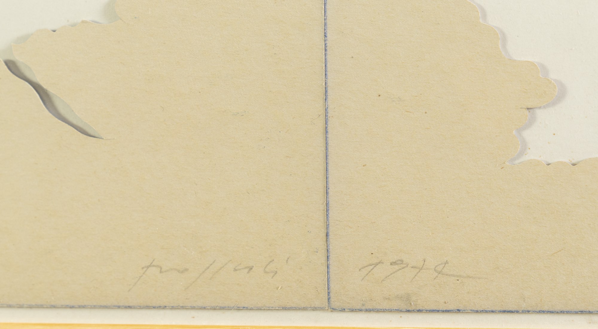 Tecnica mista e collage su cartoncino, firmato e datato a matita in basso al centro, con cornice H cm 74x104
