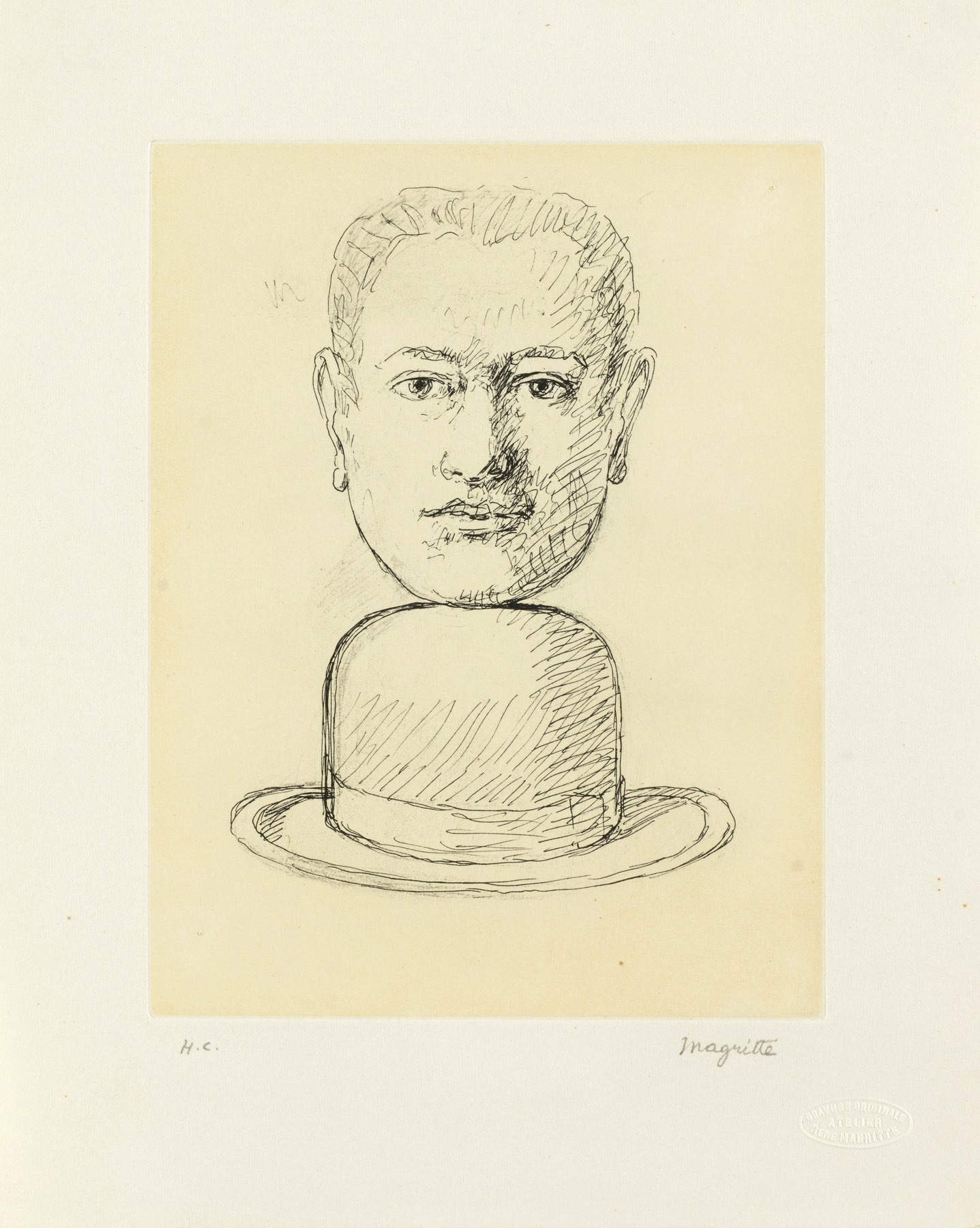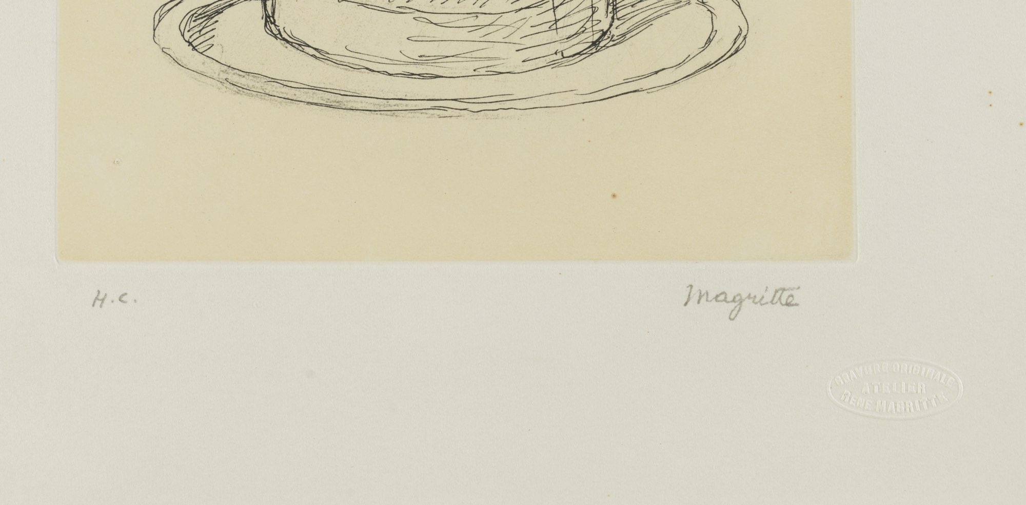 Acquaforte su carta japon, reca timbro a secco in basso a destra con scritto Bravure originale Atelier Rene Magritte, reca tiratura a matita in basso a sinistra H.C., reca firma stampata in basso a destra, foglio H cm 28x23, lastra H cm 14x11 - Bibliografia di riferimento: The Graphic Work of Rene Magritte, a cura di Kaplan Gilbert E. e Timothy Baum, II Editions, Institutional Investor Inc. New York, 1982 N.19.